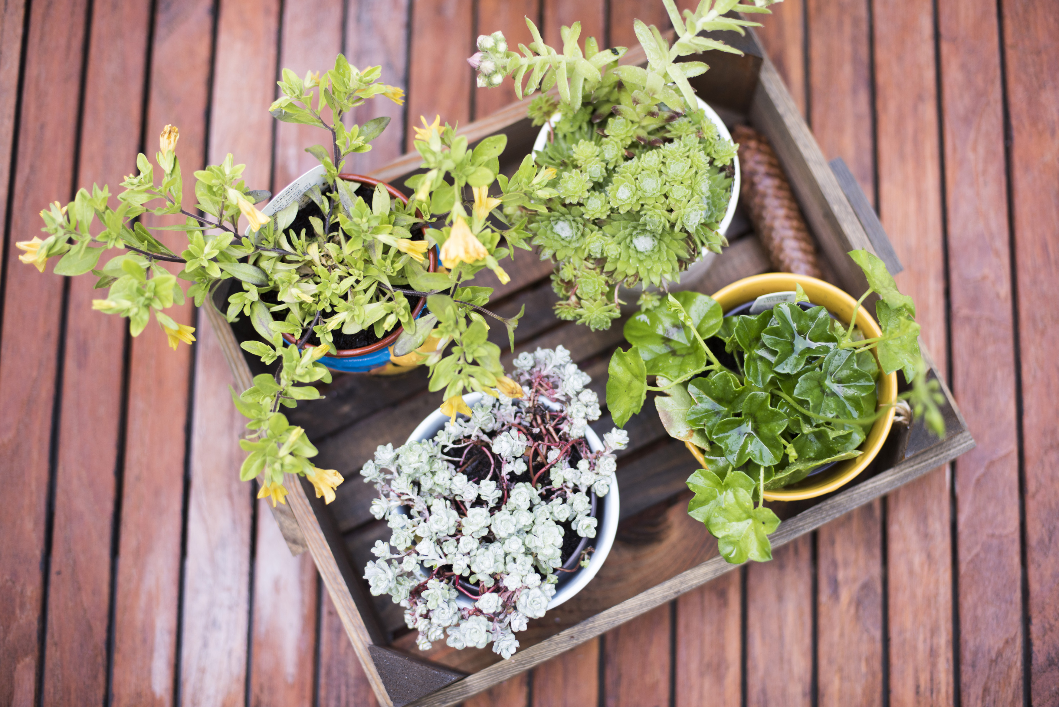 Keywords: above, crate, deck, geranium, houseplant, plants, potted, seedlings, succulents, gardening