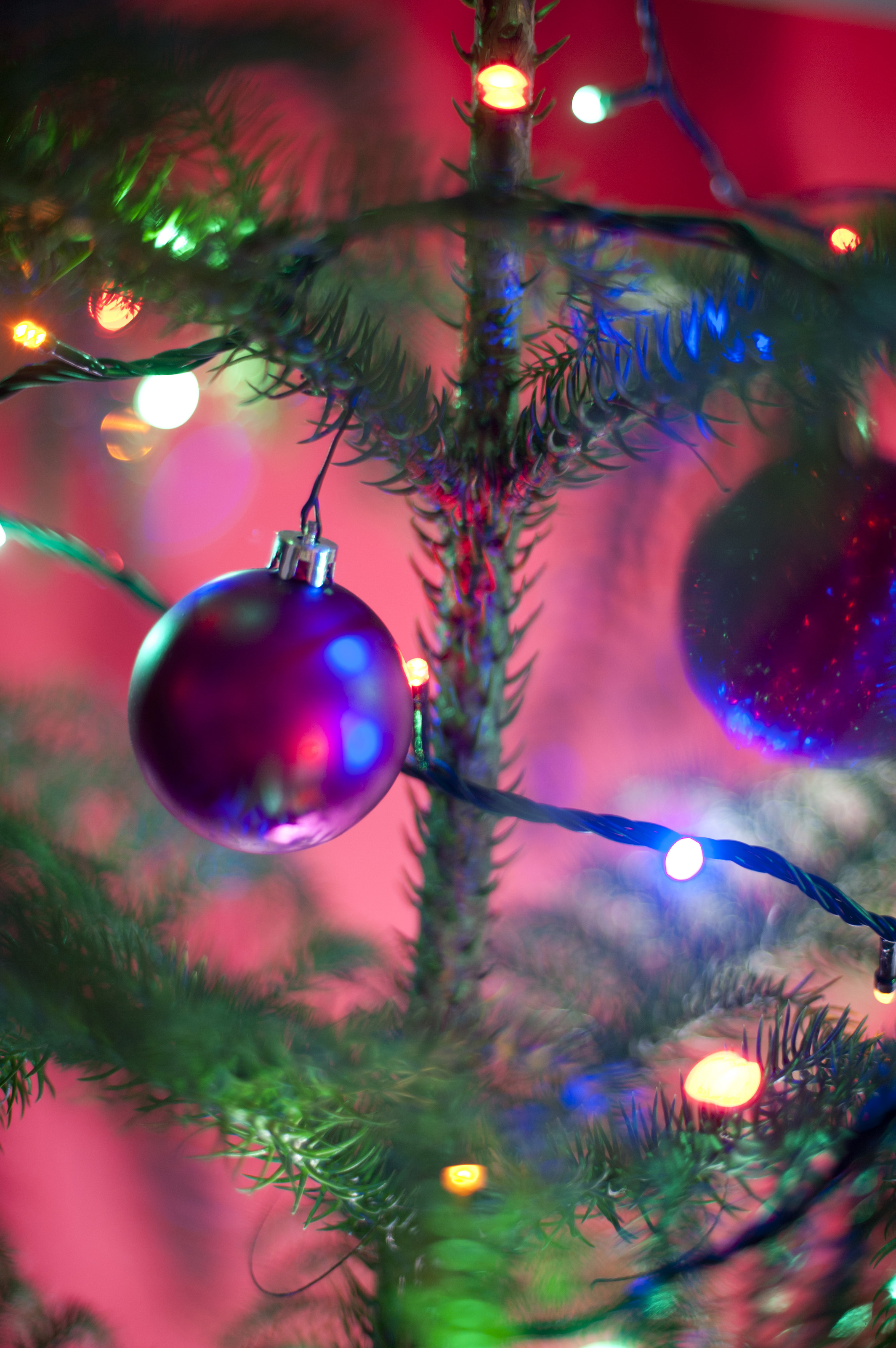 Festive purple bauble on a natural evergreen coniferous Christmas tree with twinkling colorful seasonal lights over a colorful pink background