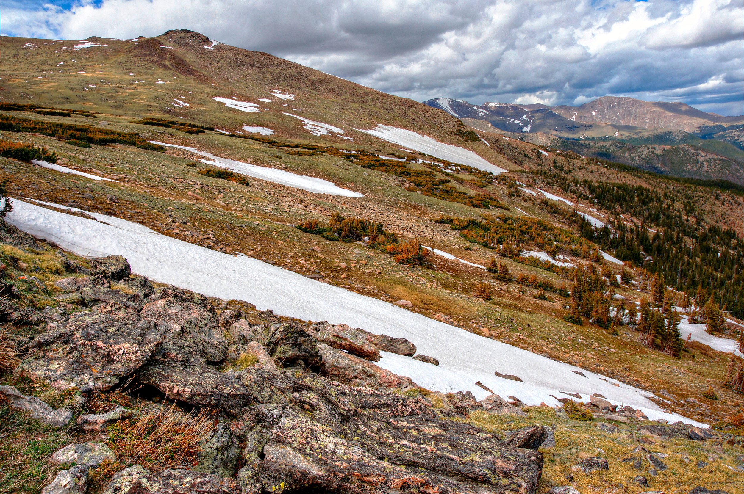 Snow fields lie on the tundra at Rocky Mountain National Park. In this scene, rock in the foreground gives way to a series of high altitude pine forests and snow fields. Distant mountains lie under stormy clouds.