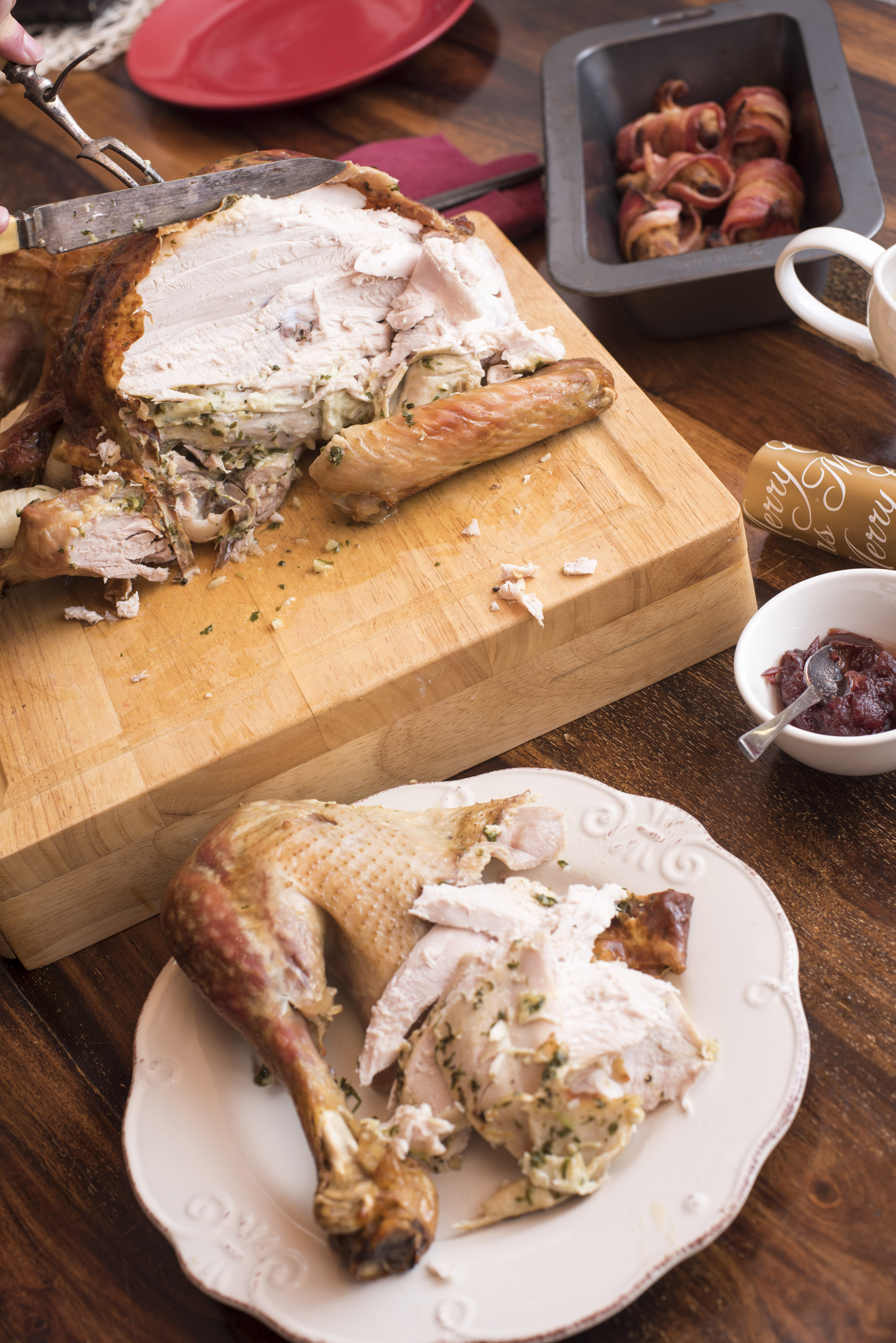 Keywords: carving, christmas, serving, slicing, turkey, meat, roast, leg, plate, bacon rolls, table, dinner, food, drumstick, holiday