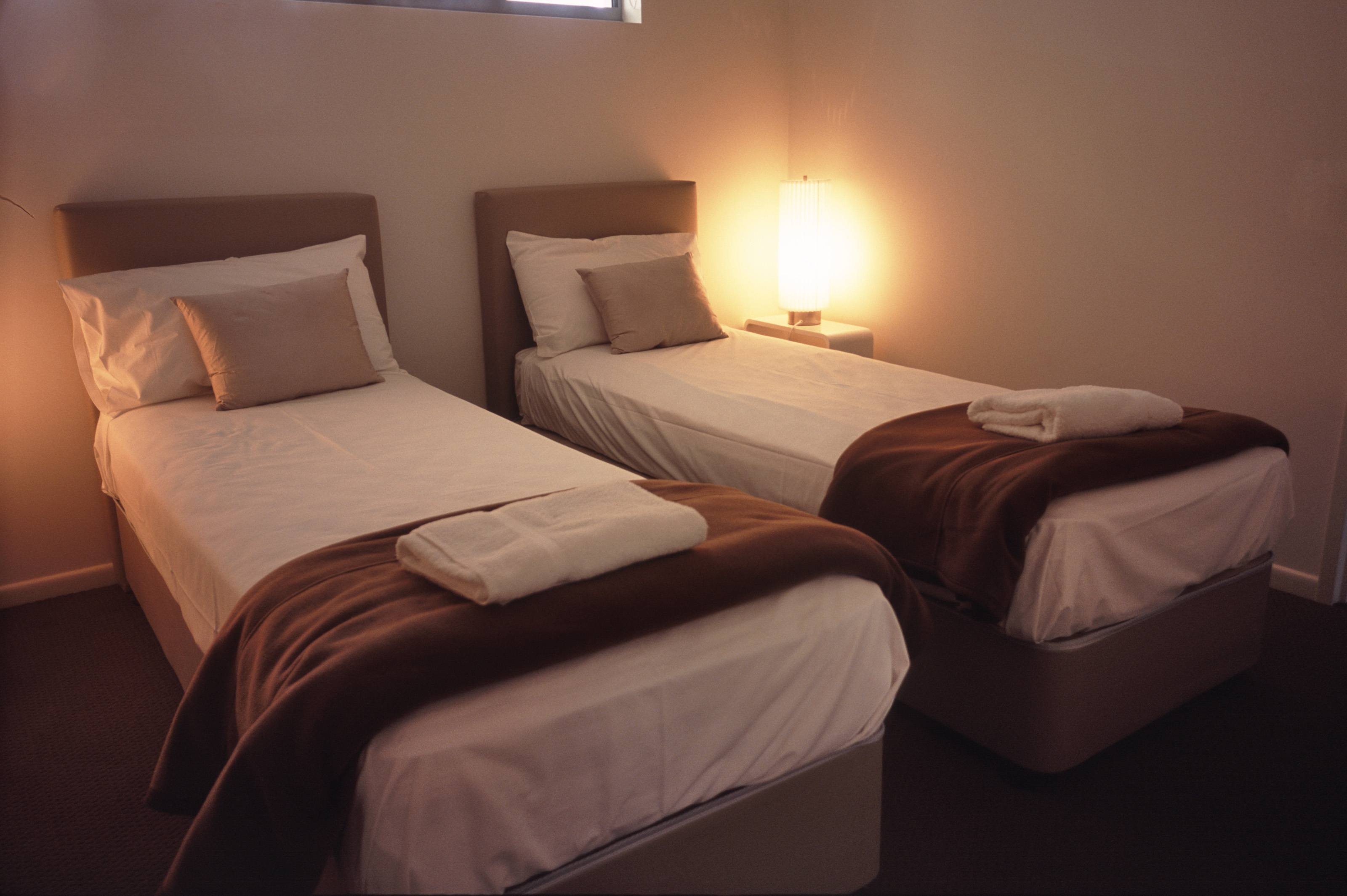 Keywords: bed, bedroom, accommodation, bed and breakfast, hotel, sleeping, twin, decor, hospitality, illuminated, industry, interior, lamp, travel, furnishing, twin singles, minimal, devan