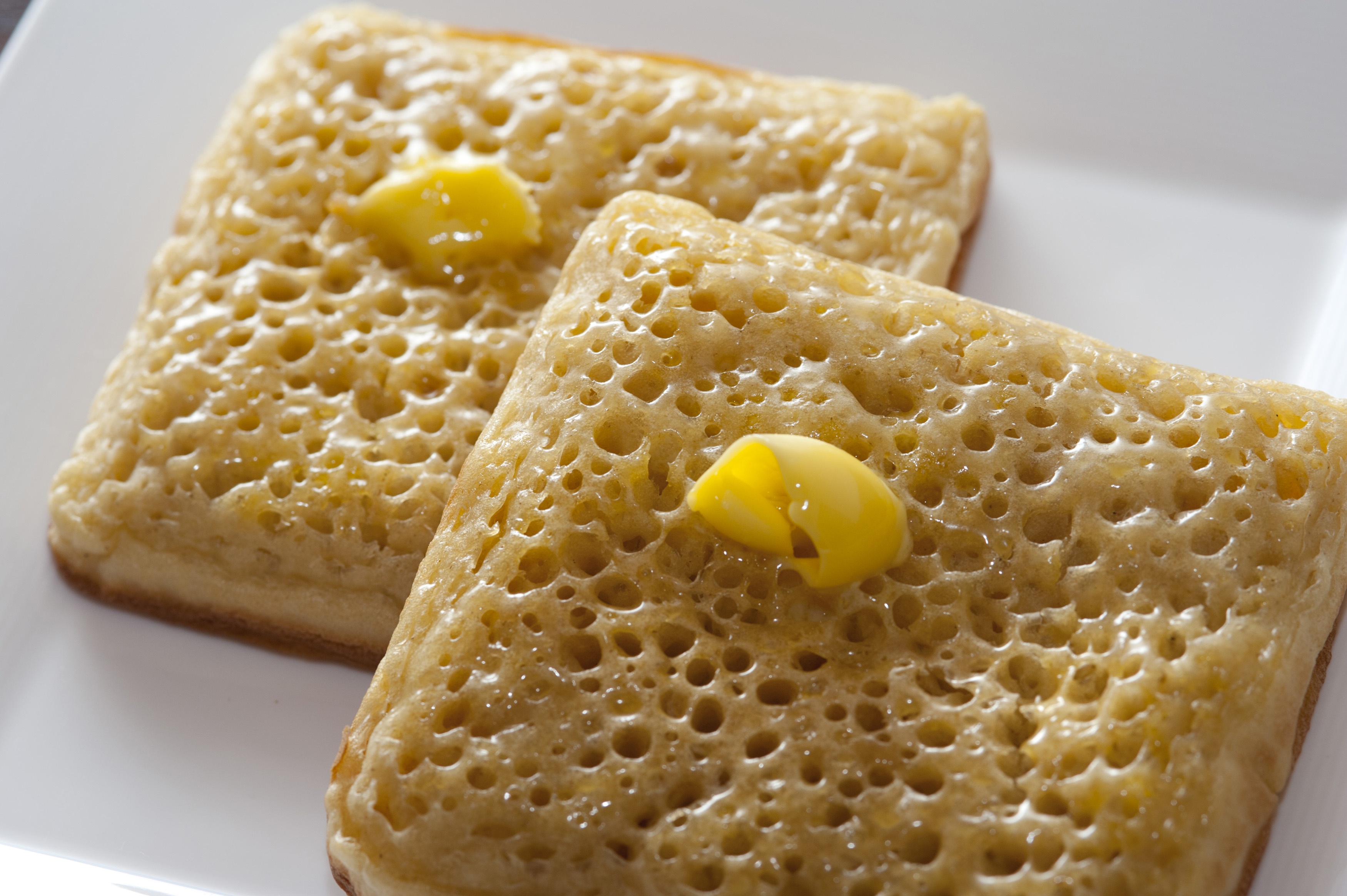 12279 butter melting on two crumpets - this image by freefoodphotos is licensed under a Creative Commons Attribution 3.0 Unported License.