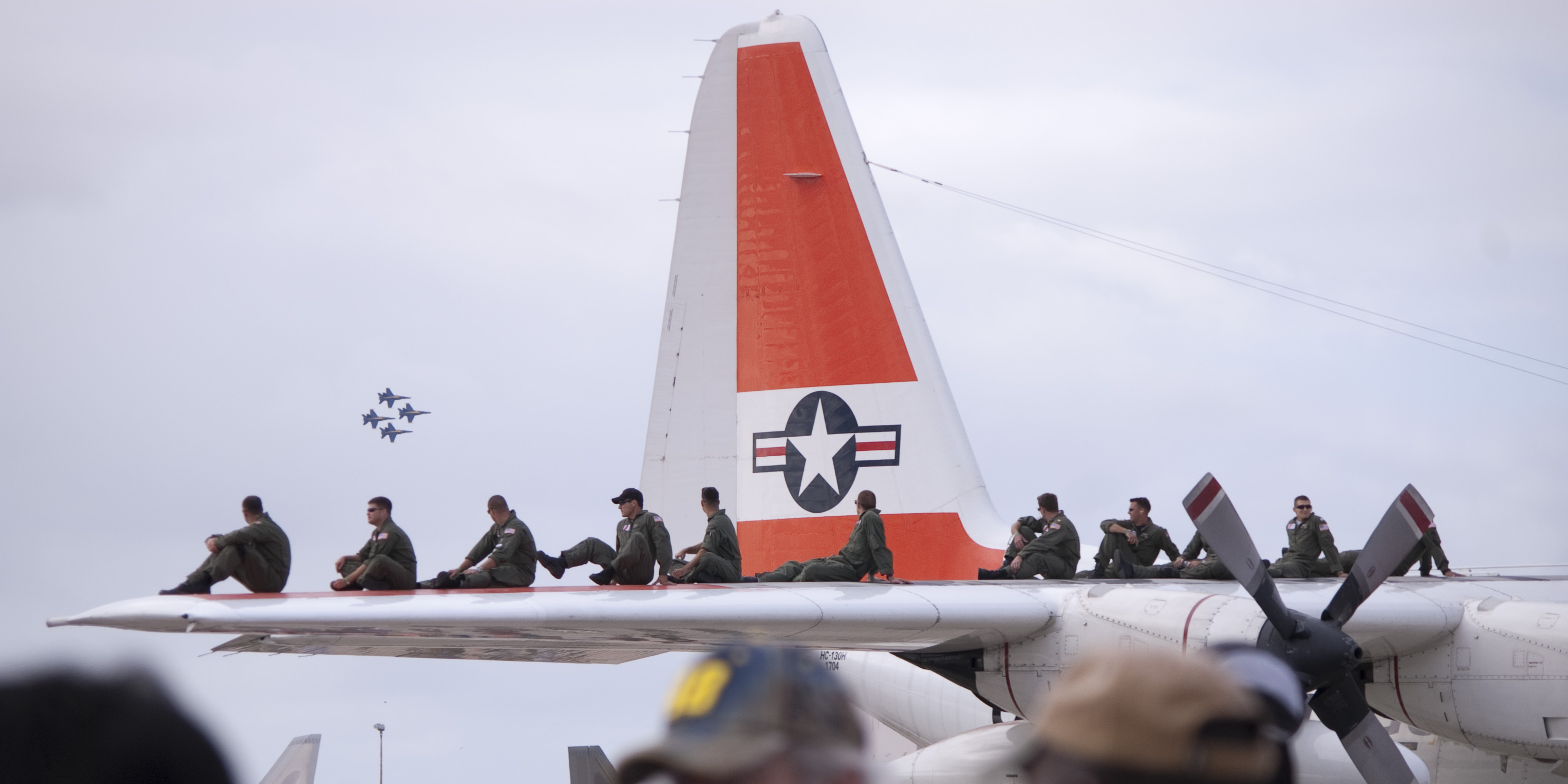 editorial use only : crew line up on the tailplane of a USCG hercules during an airshow
