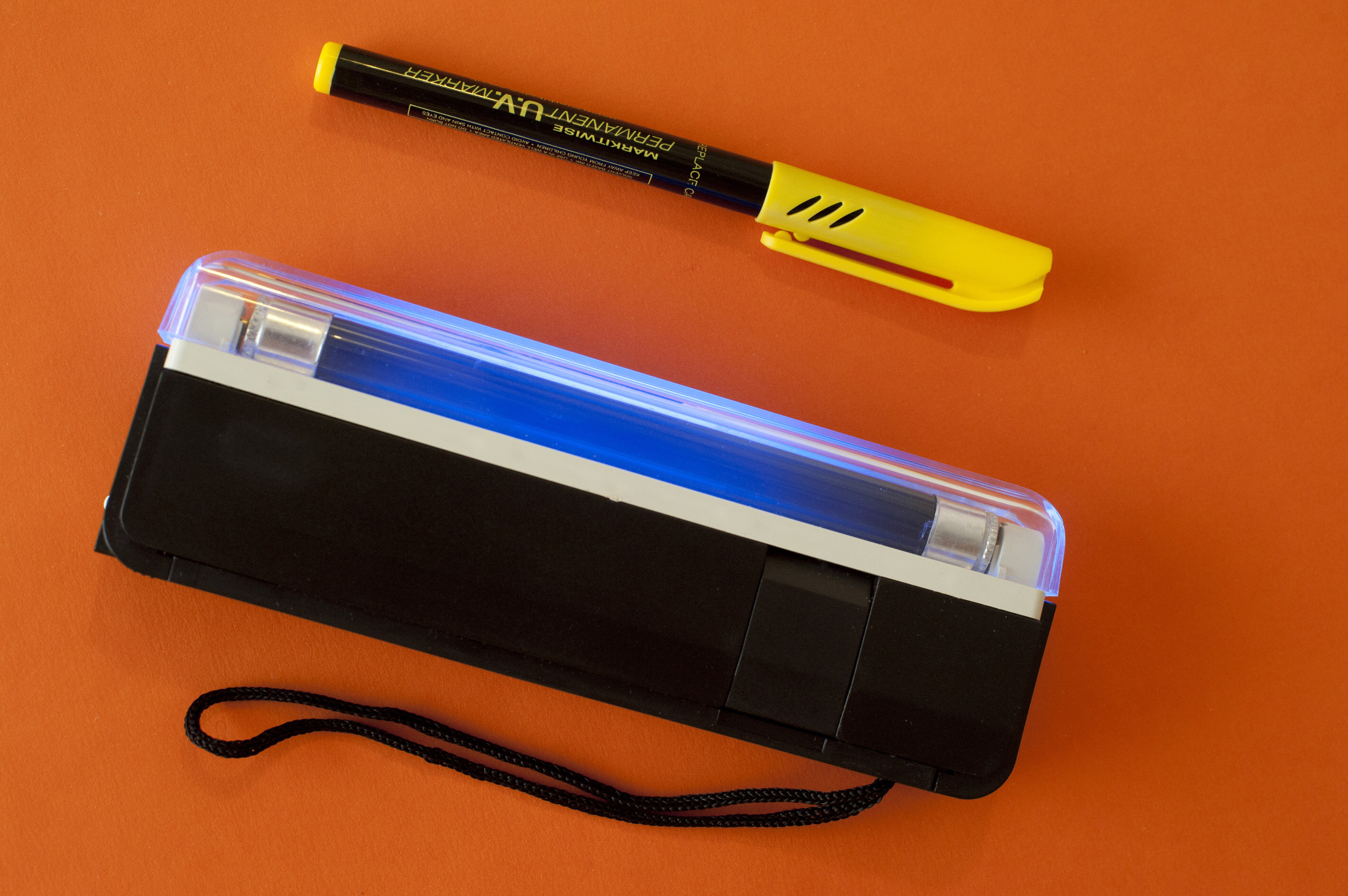 Close up UV Marker Technology with Case Isolated on Orange Background