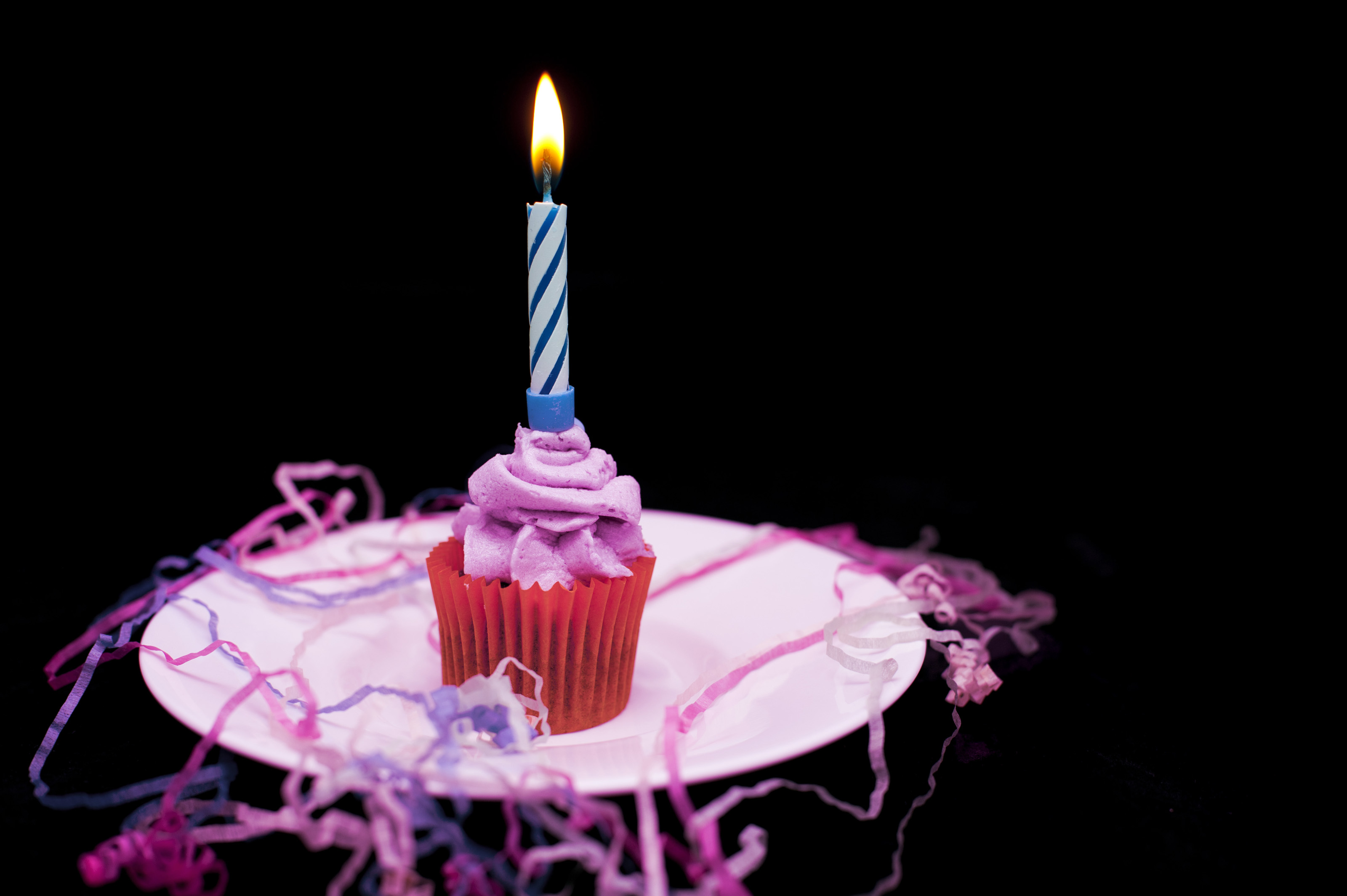 a small cup cake with pink icind, a candle and paink and blue celebration streamers