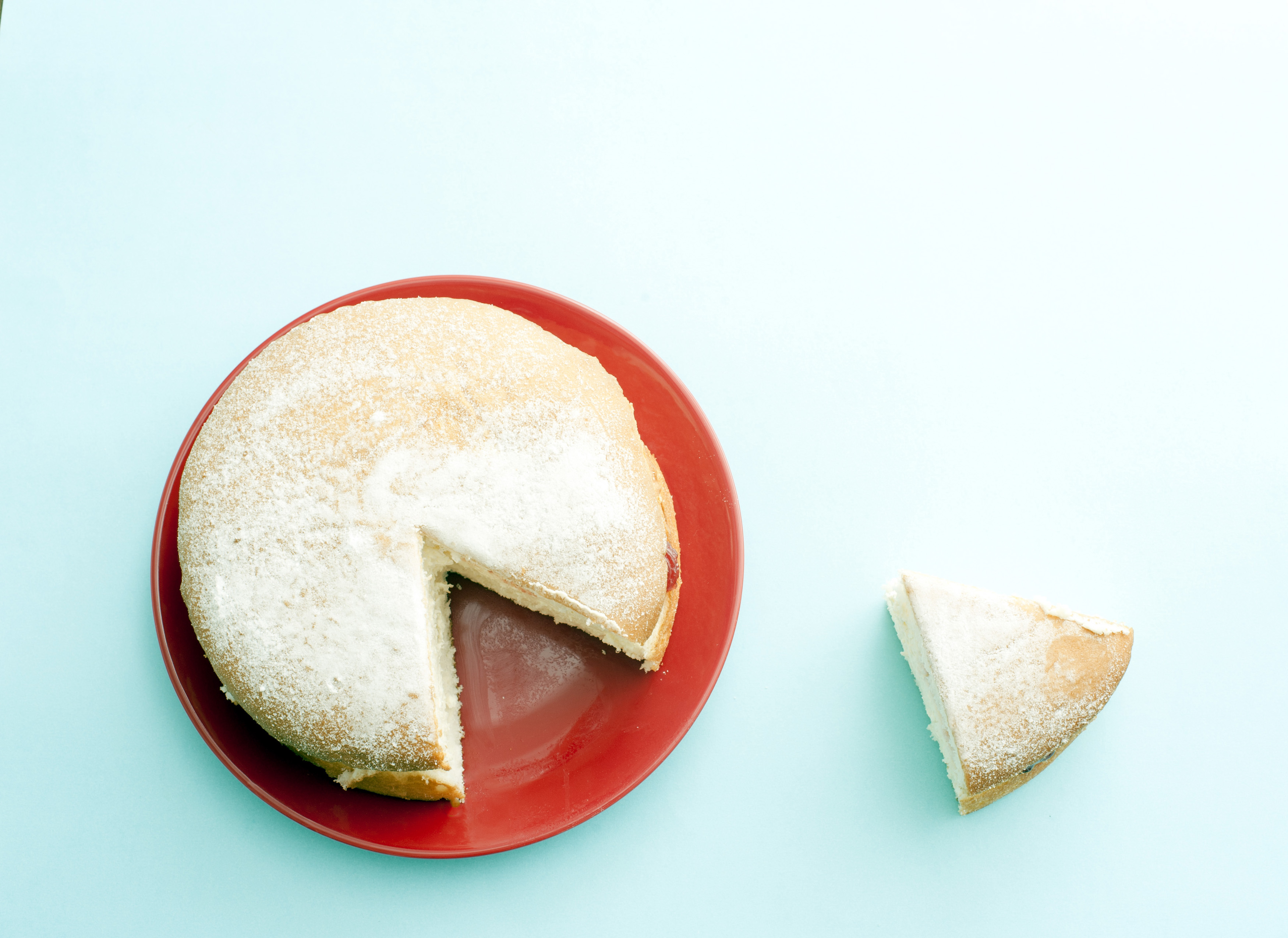 Homemade Victoria sponge cake with a cut slice set to the side, overhead view on a red plate on a blue background with copy space