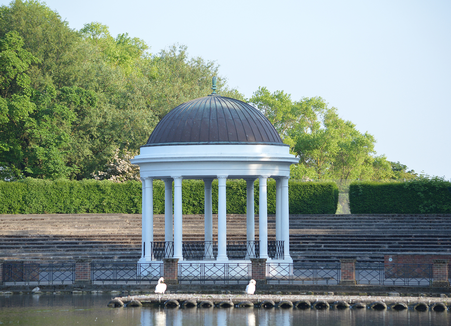 Victorian bandstand by a lake.