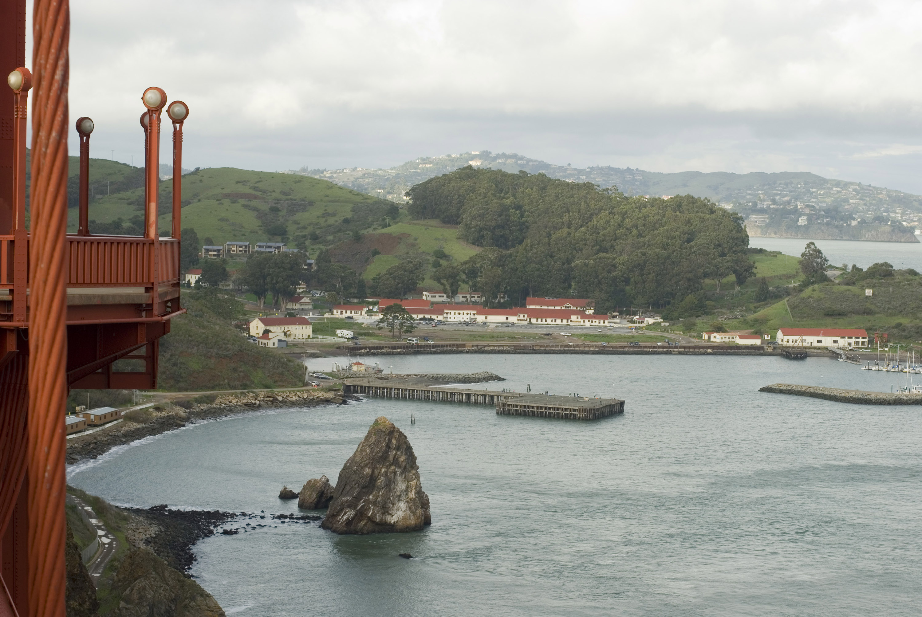 Keywords: north end of the golden gate bridge, marina, harbour, bay, shore, park, golden gate, san francisco, sausalito, tree rocks, lime point