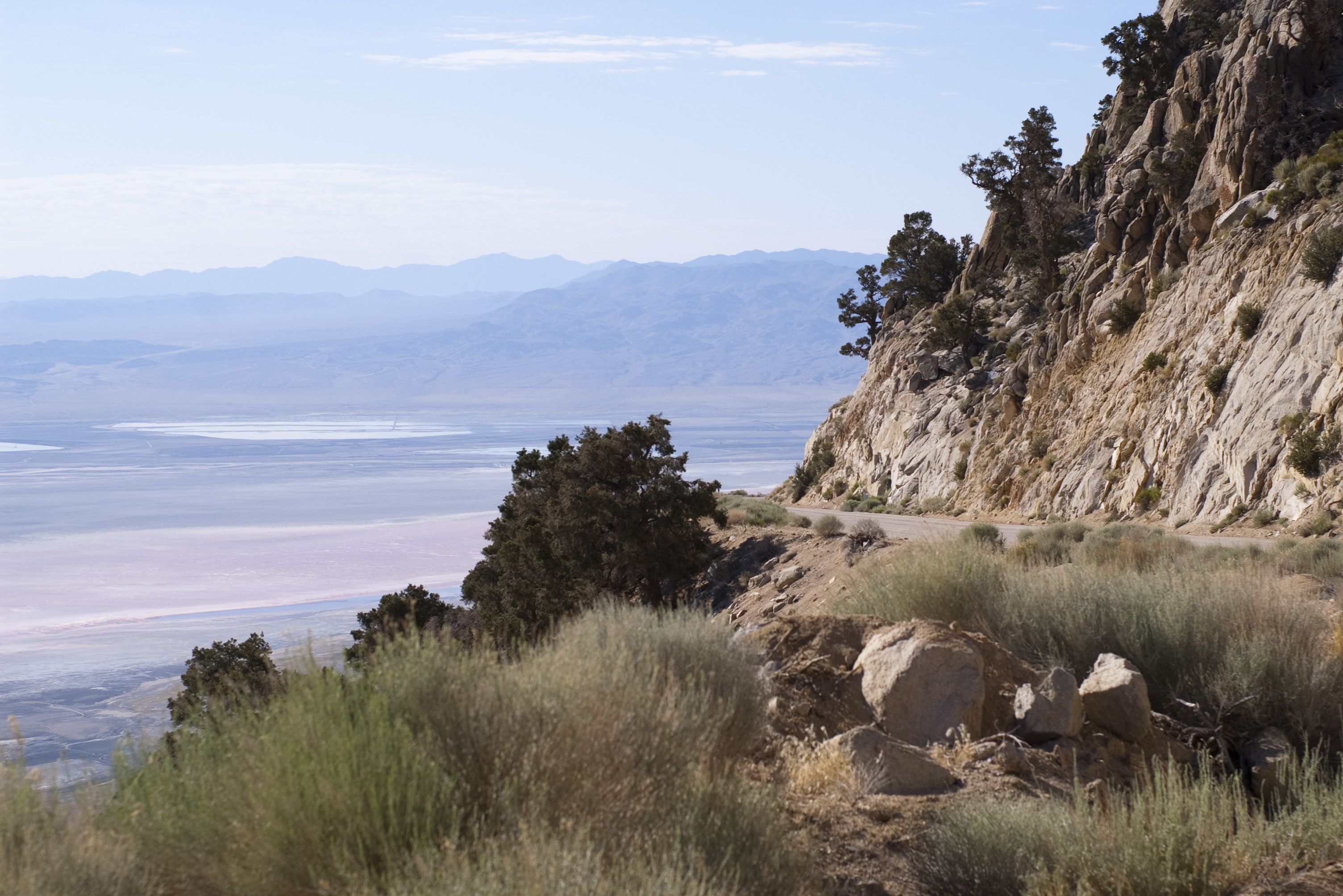looking down from a roadside vista point across vast expanses of desert landscape