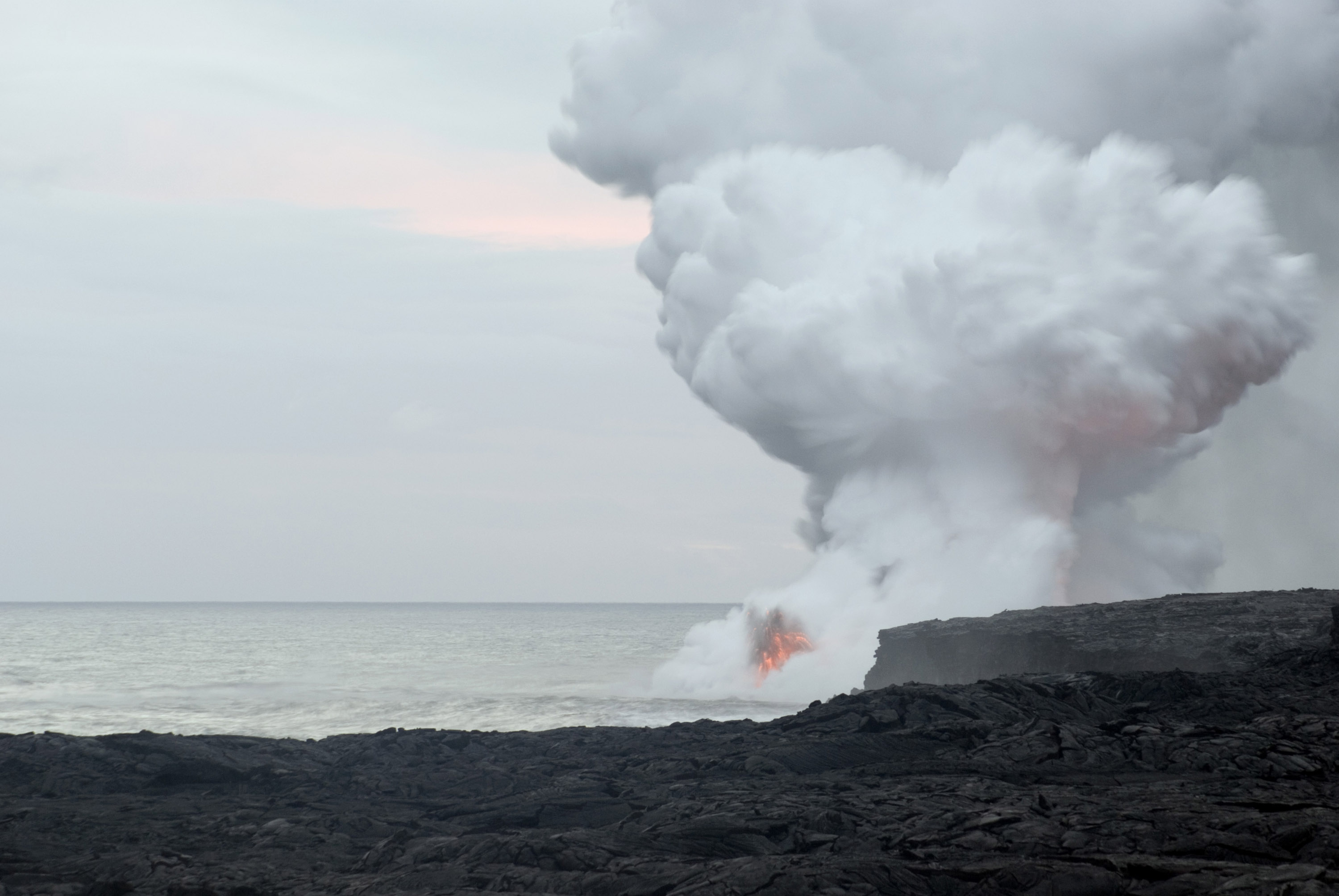 Keywords: hot, lava, red, glow, smoke, steam, lava flow, sunset, dusk, sea, ocean, water, explosion, errupt, errupting, volcanic, volcanoes, volcano
