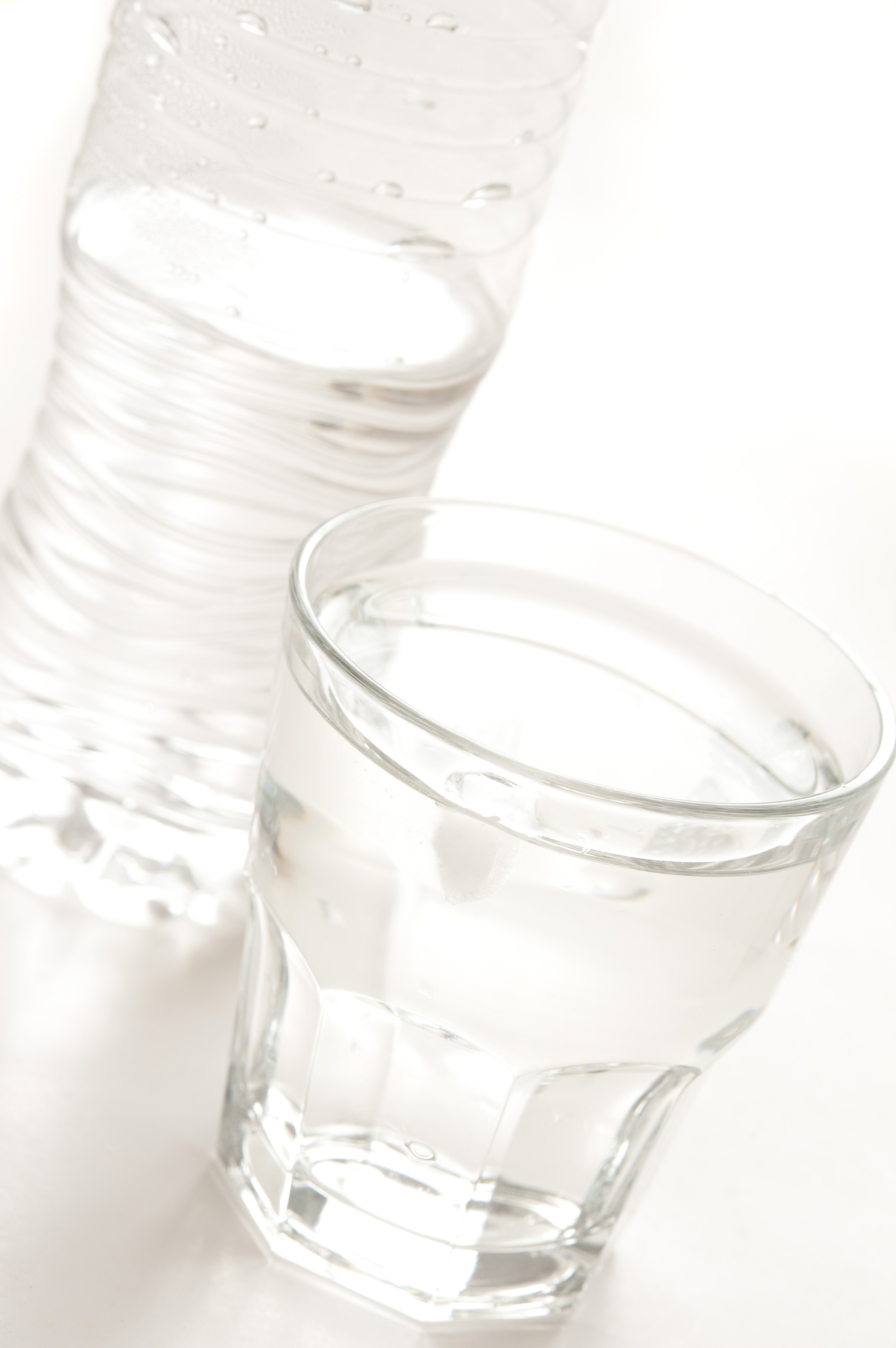 Glass of clear clean pure bottled water with the plastic bottle behind on a white background, close up tilted angle