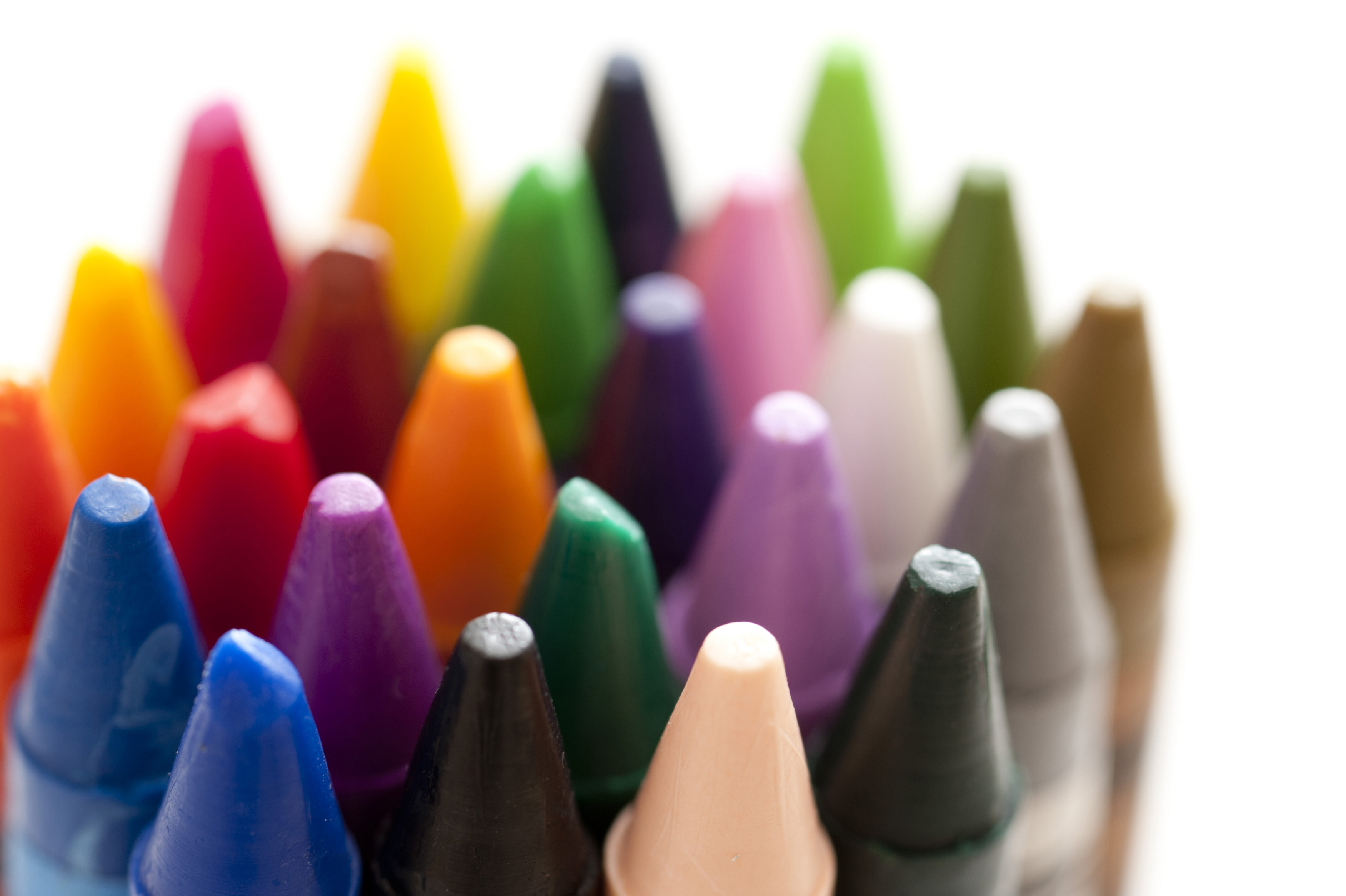 Bundle of colorful wax crayons with a close up shallow DOF view of the points over white in an educational and creativity concept