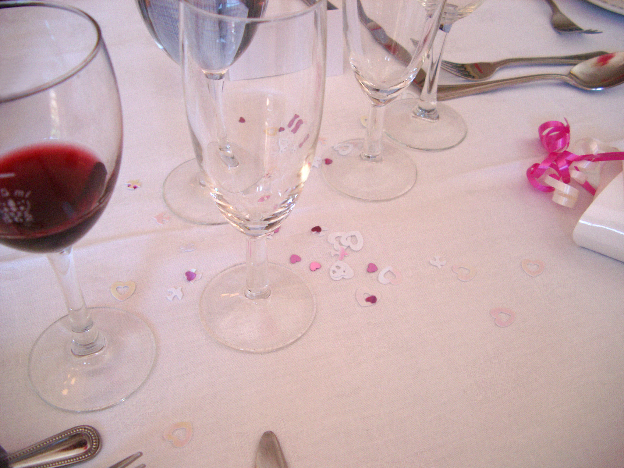 Keywords: wedding, pink, place setting, confetti, confetti, decoration, glitter, cuttlery, glass, winde, drink, celebration
