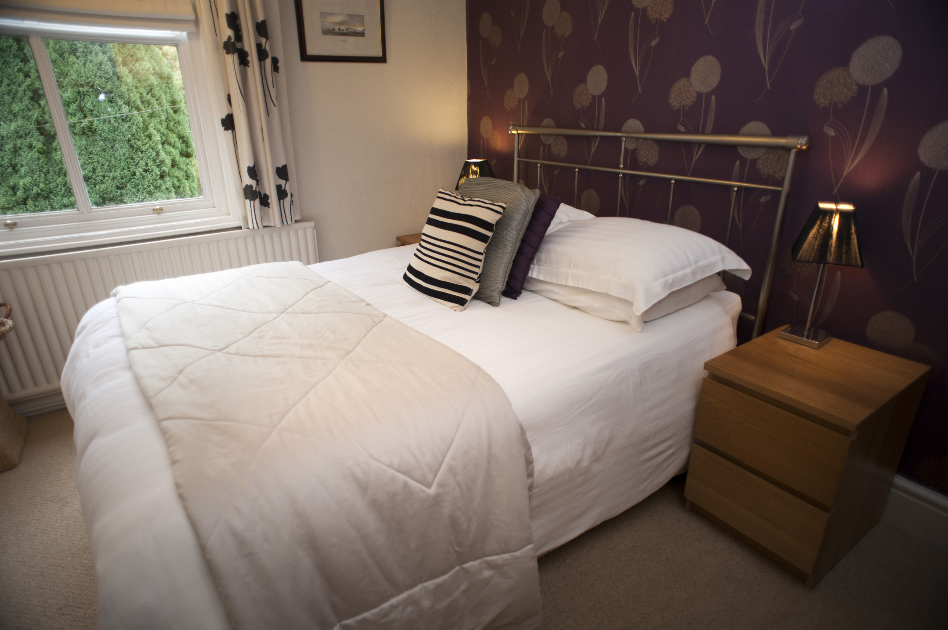 Welcoming bedroom with a classic wrought iron double bed, a quilted throw, neutral decor and a window overlooking greenery in the garden