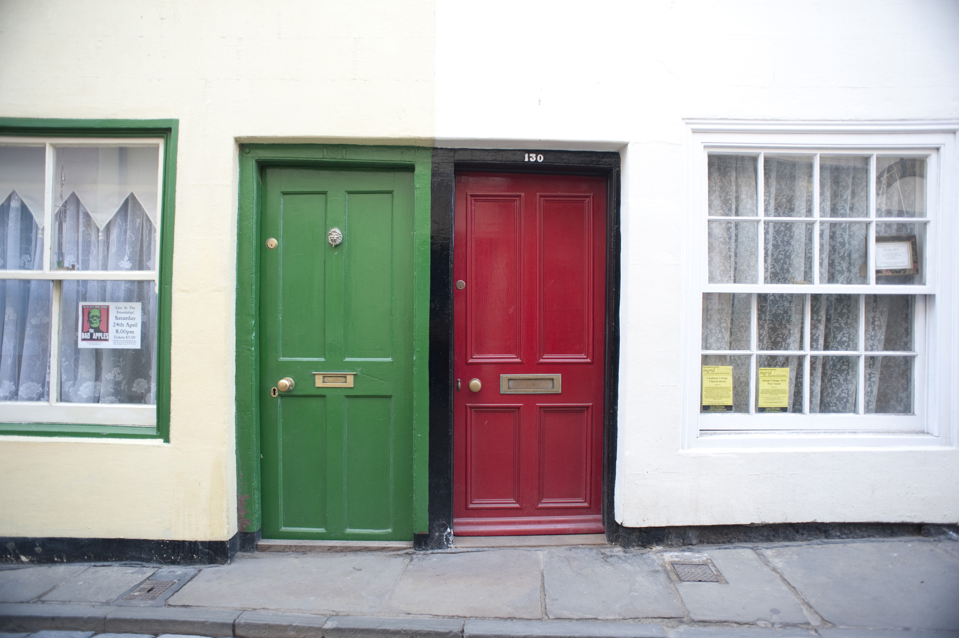 The coloufrul front doors of Caedmon Cottages in Church street in Whitby which are holiday rental premises