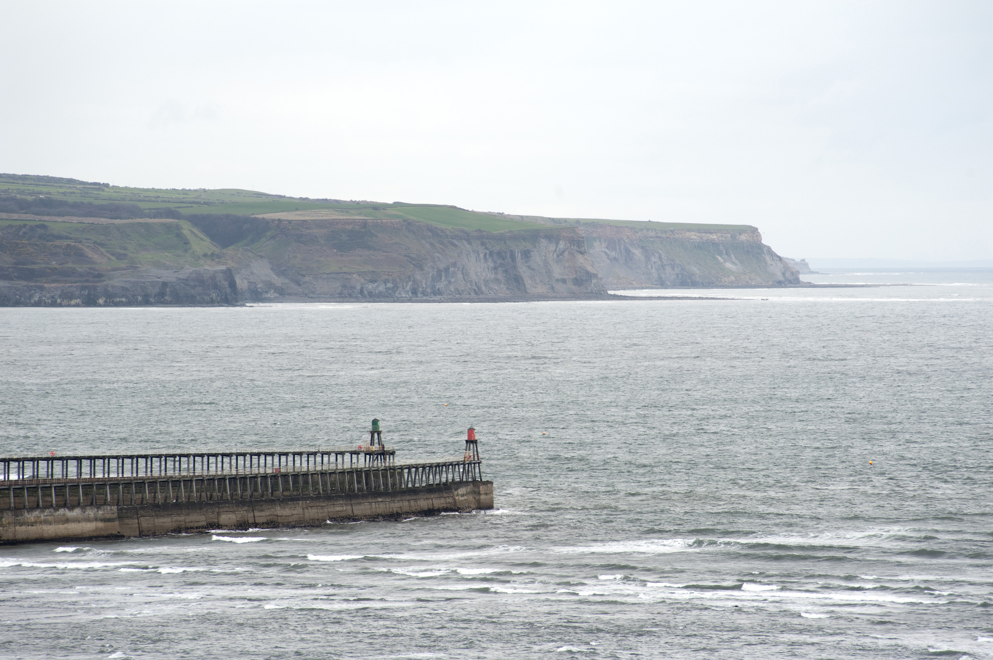 Keywords: entrance, shelter, ocean, coastline, view, navigation, nautical, marine, england, misty, overcast, cliffs, harbour, yorkshire, topography, seawall, whitby, headland, breakwaters, beacons