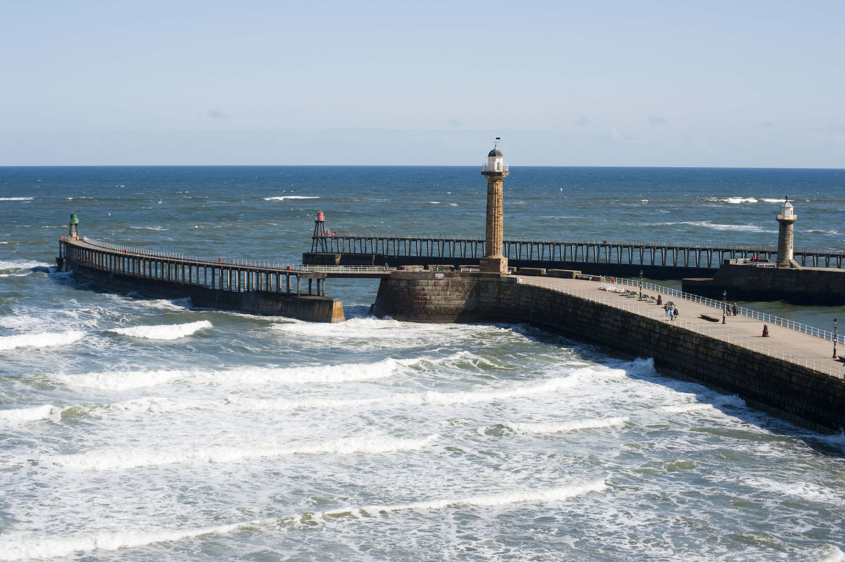 Keywords: day, sea, seascape, water, waves, stone, pier, jetty, england, north sea, breakwater, elevated view, piers, whitby, north yorkshire, light house, navigation lights, sheltered waters
