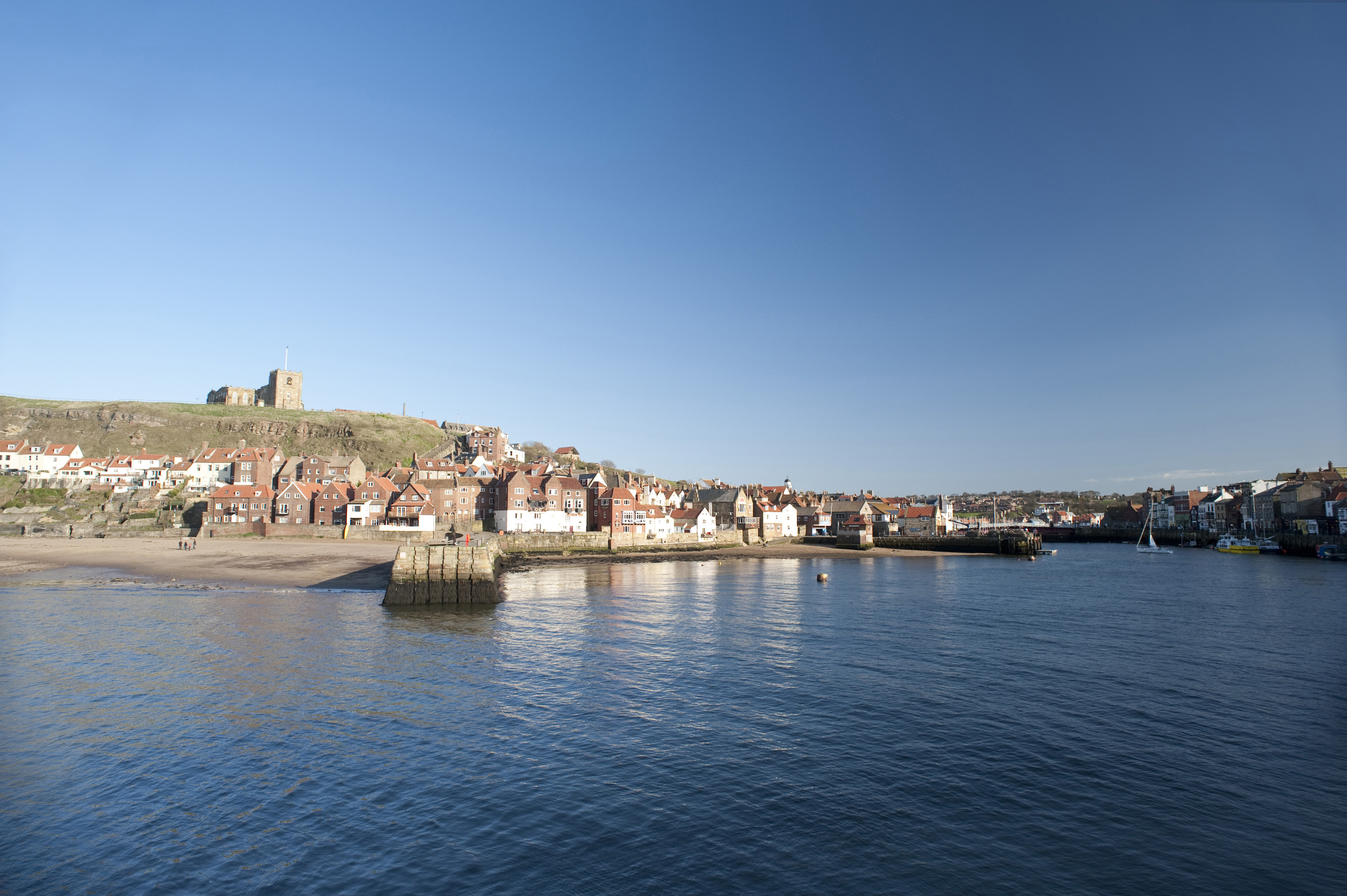 View across the River Esk to Tate Hill and Whitby town with St Marys church perched on the skyline