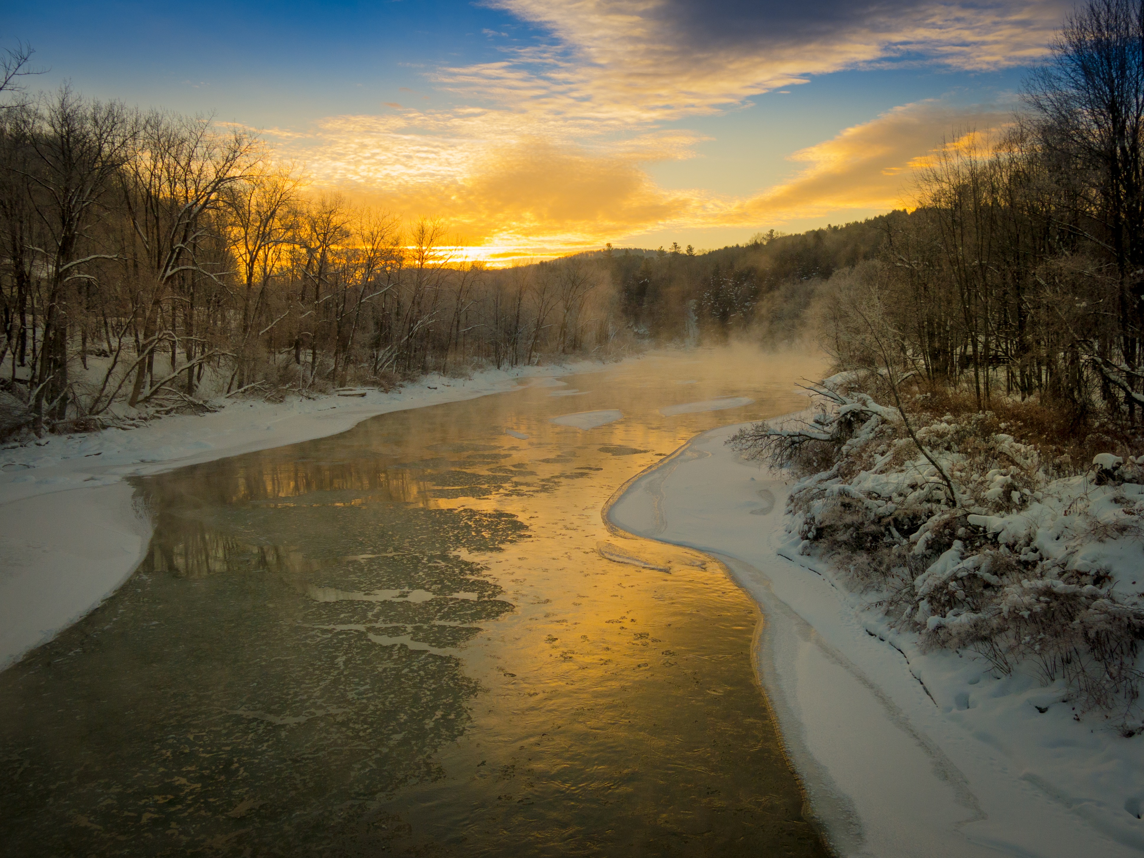 Golden sunrize on the White River, in winter, in Bethel Vermont from the new bridge.