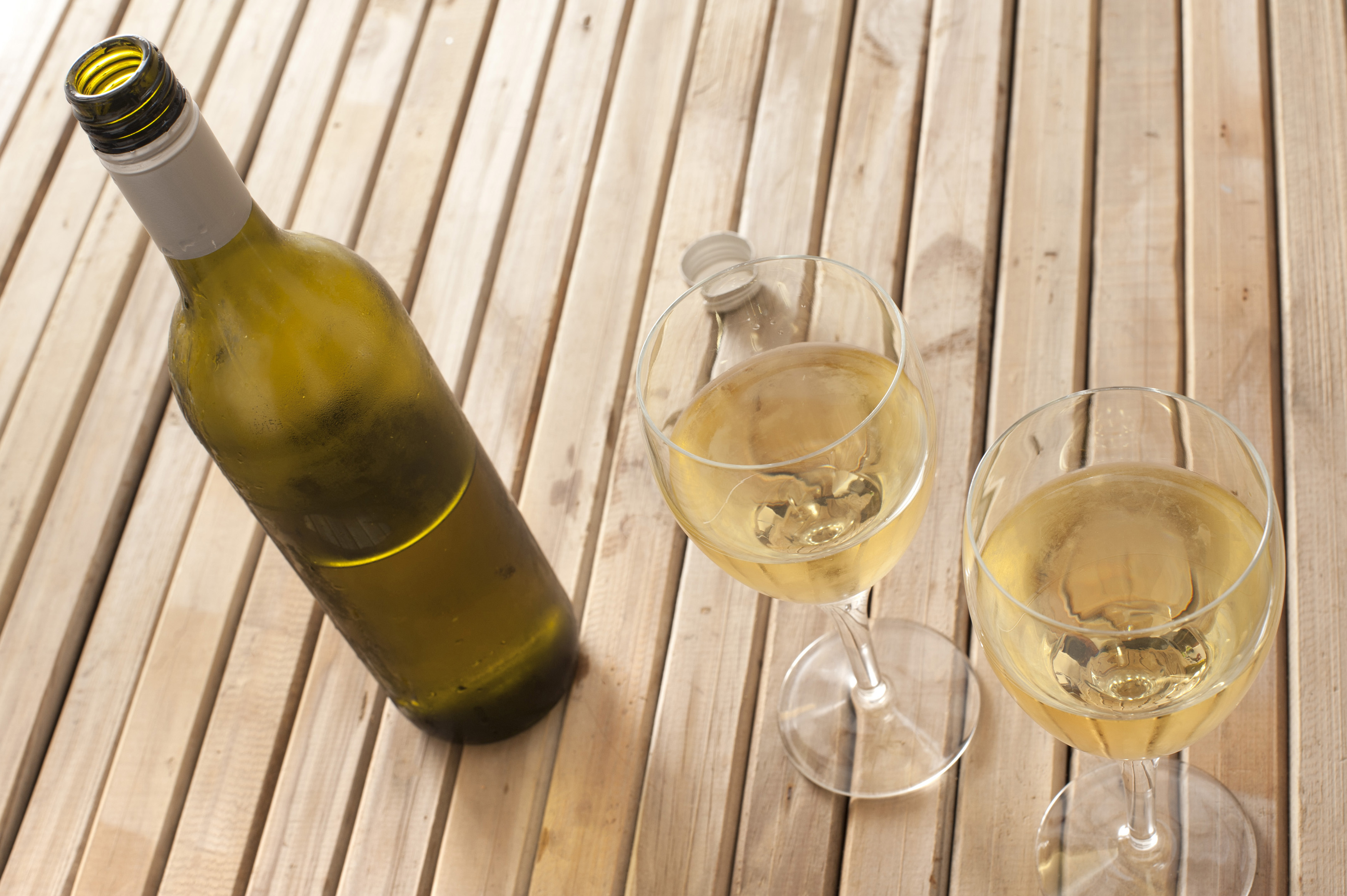 Serving of chilled white wine in two wineglasses alongside an unlabelled bottle on a slatted wooden table, high angle view