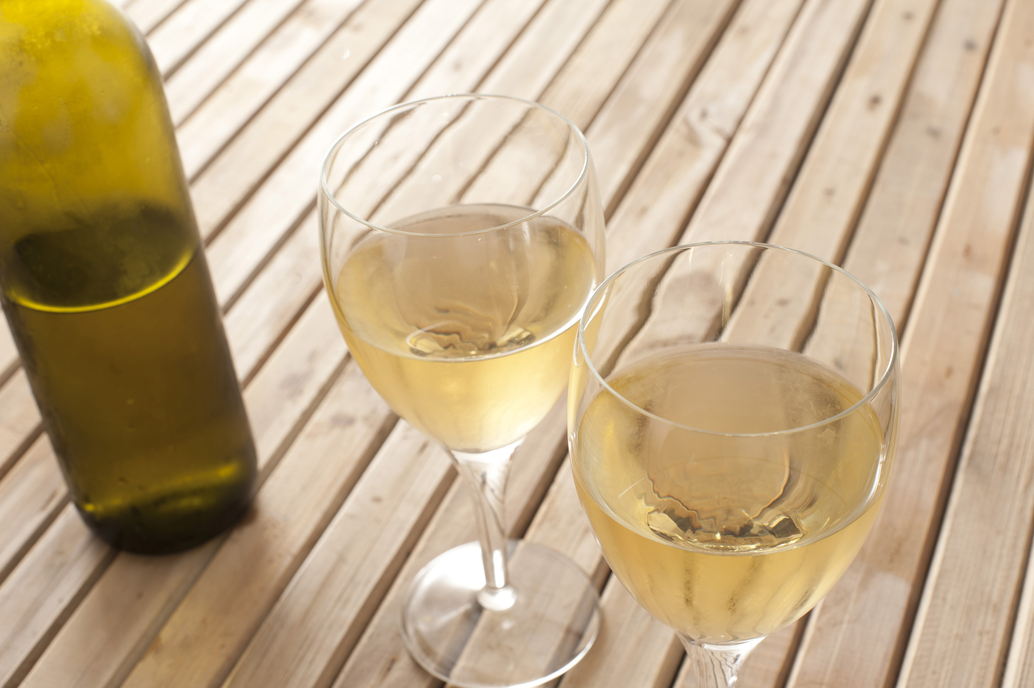 Keywords: beverage, drink, bottle, glasses, white, wine, wineglasses, table, wooden, aperitif, entertaining, party, alcohol, viticulture, unlabelled