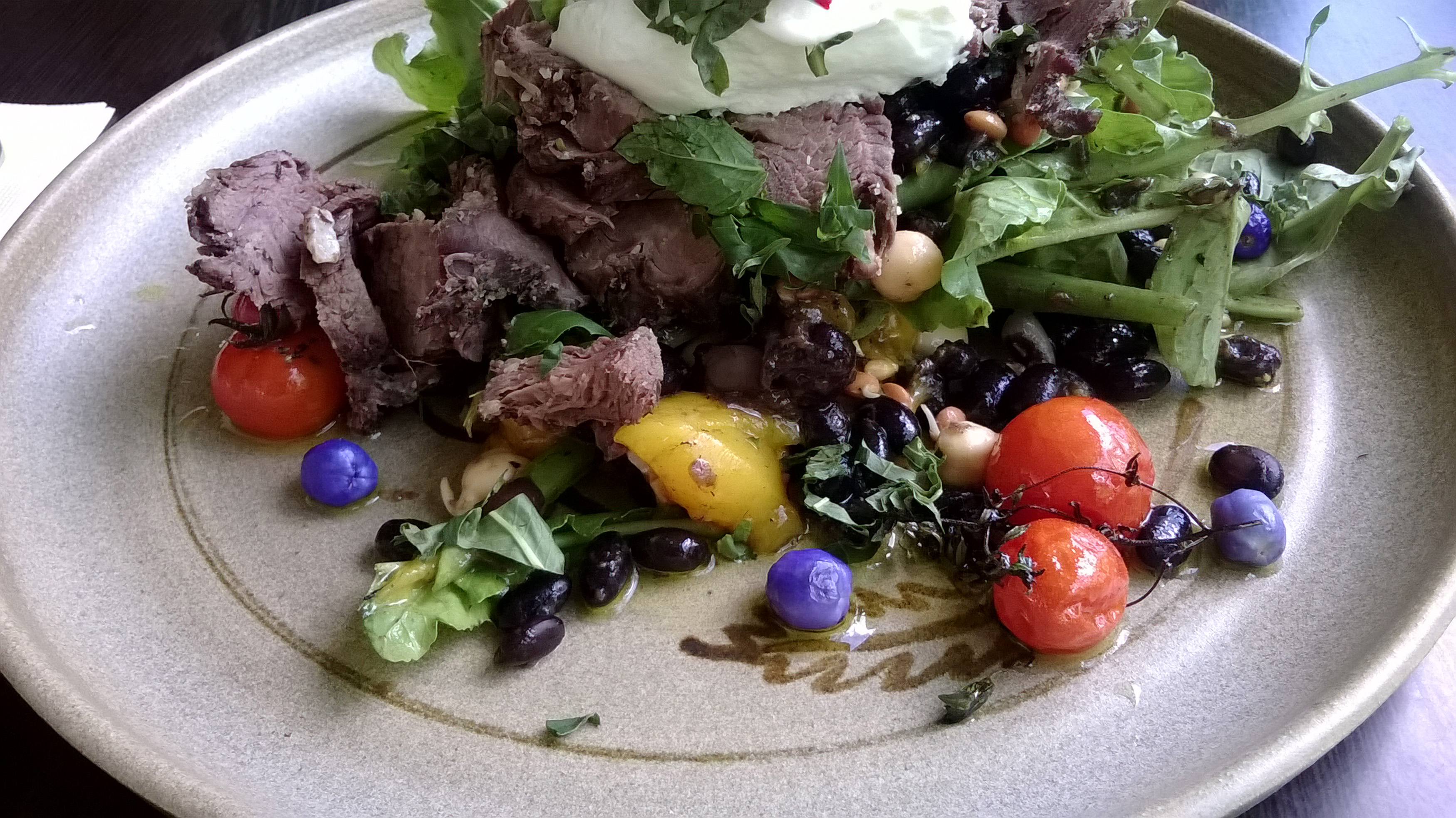 a warm beef salad with wild berries and garden salad leaves