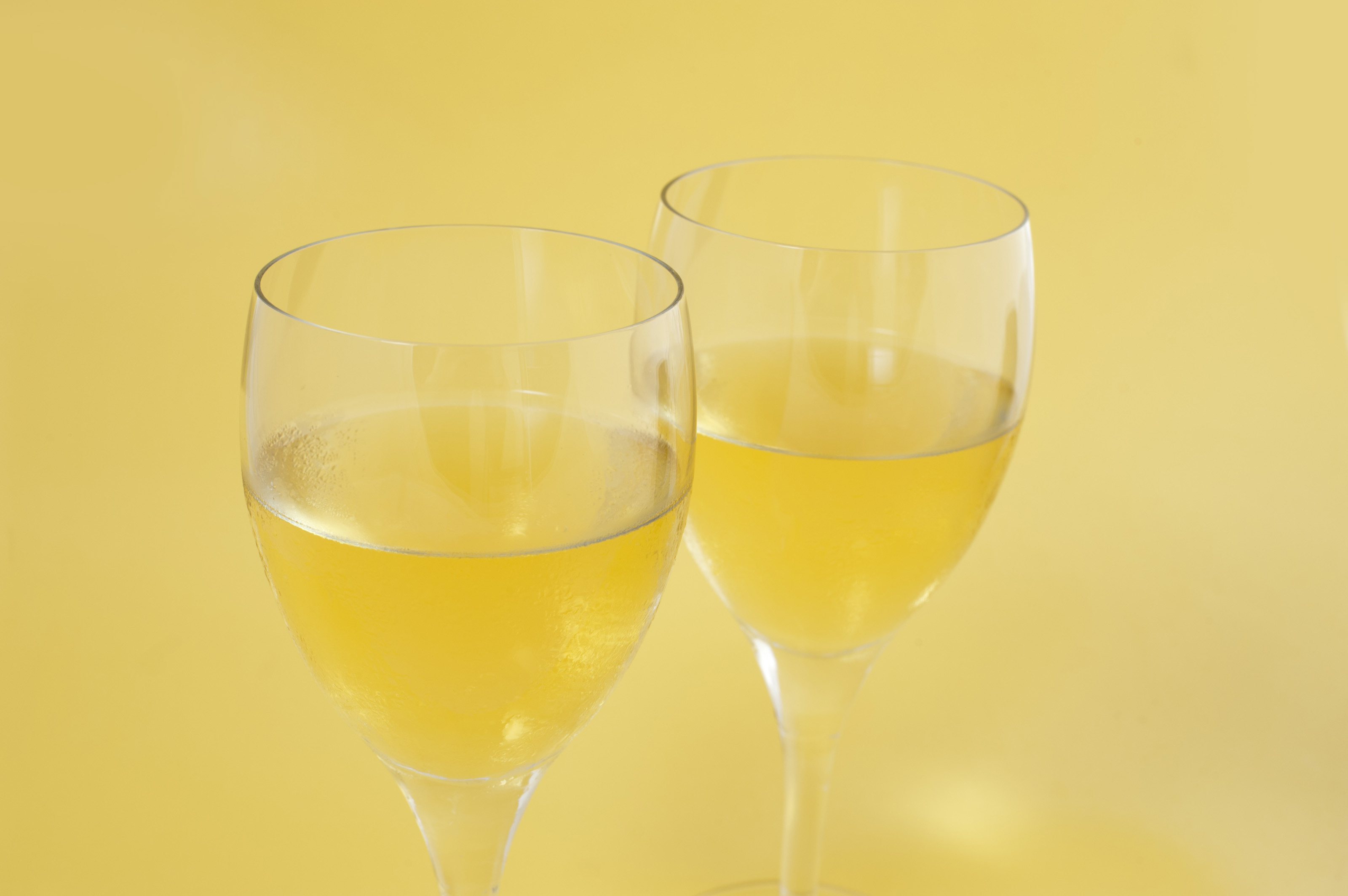 Two glasses of wine wine on a pale yellow background as an aperitif or accompaniment to a meal
