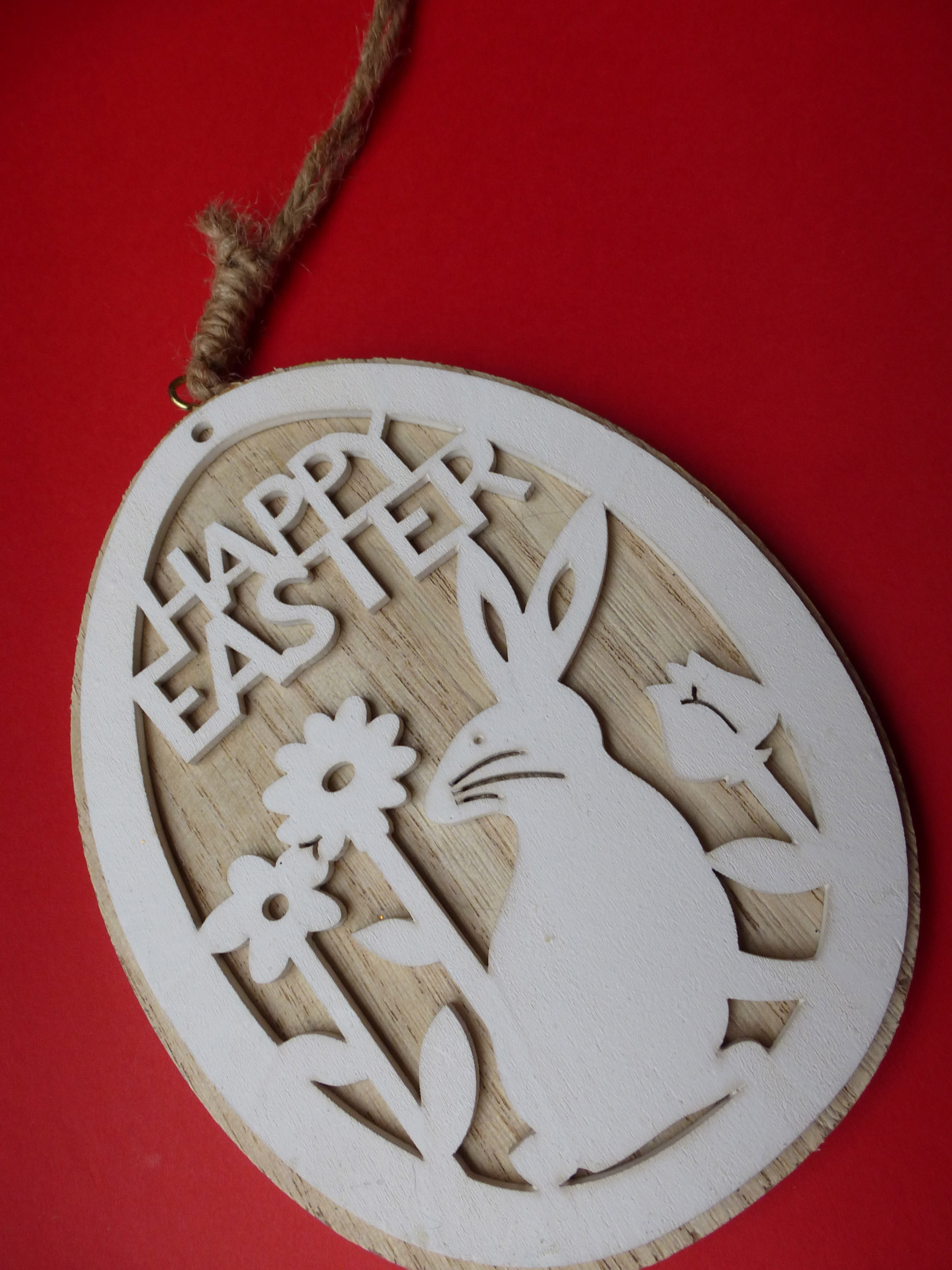 Happy Easter carved wooden pendant with a rabbit among flowers, viewed in close-up on red background