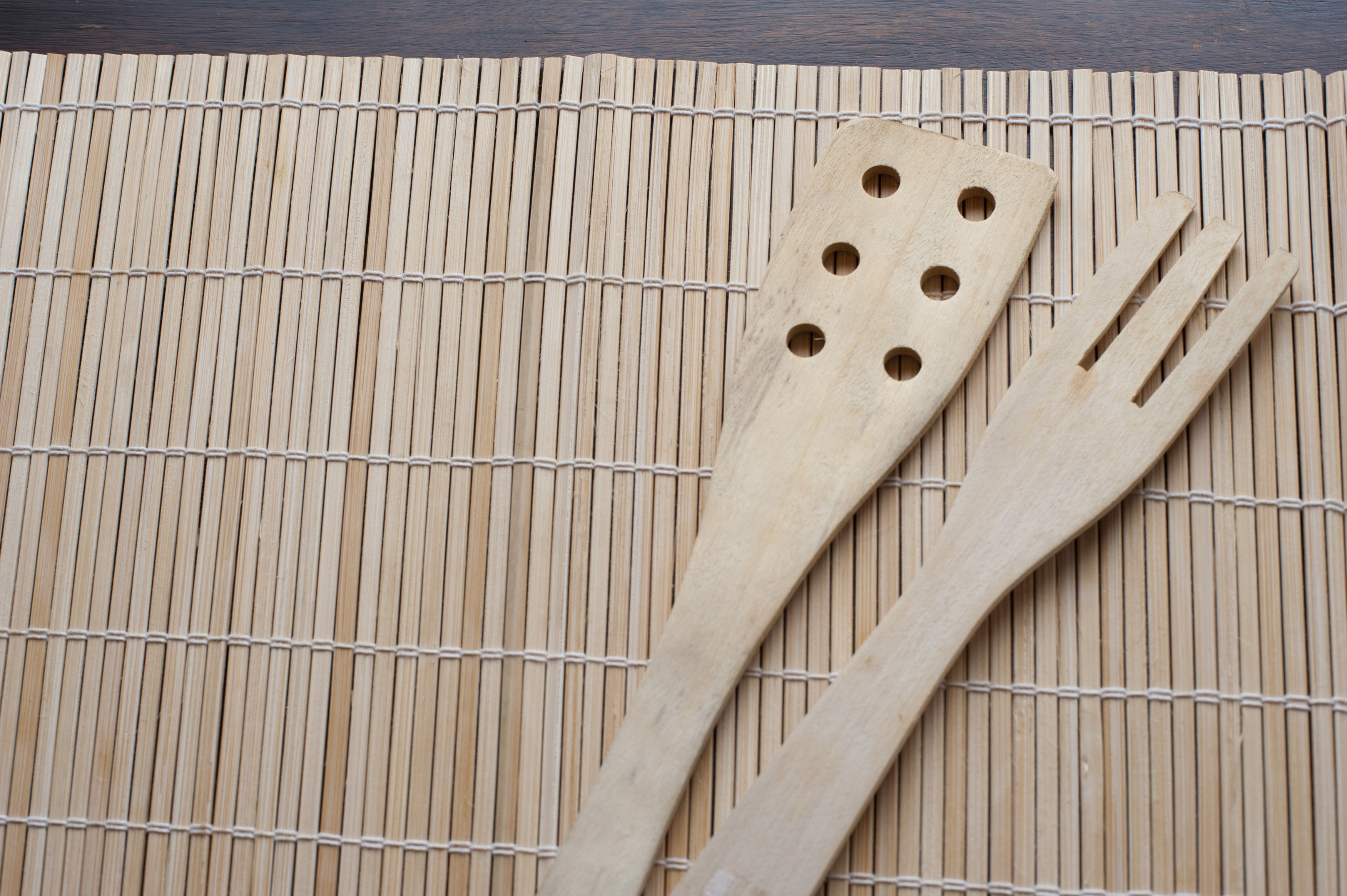 Keywords: bamboo, fork, kitchenware, mat, plain, salad, serving, spatula, wooden, copy space, food, placement, rustic, clean, set