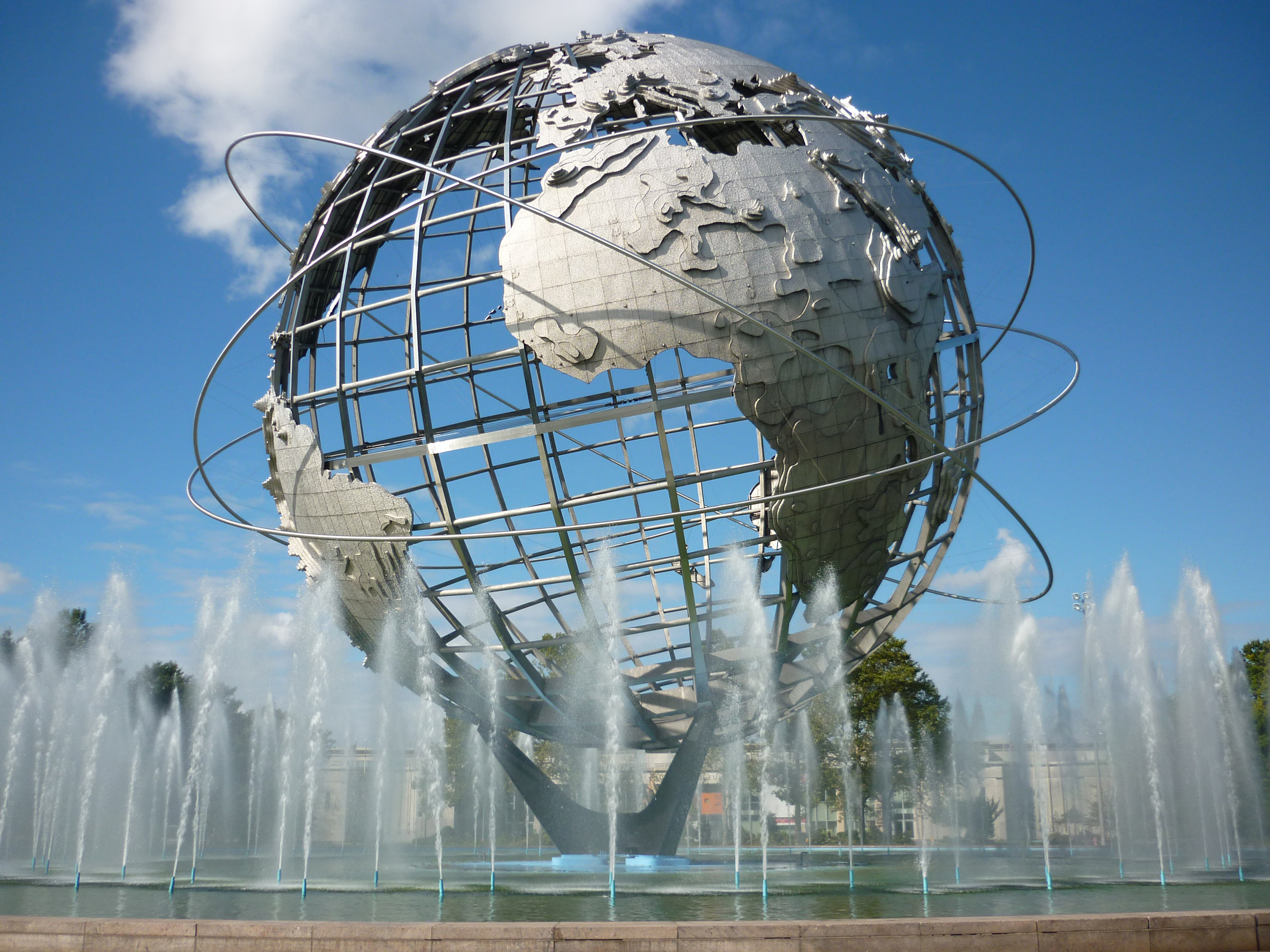 Unisphere, New York Woelds Fair, a huge stainles steel sculpture depicting the Earth with fountains in the foreground
