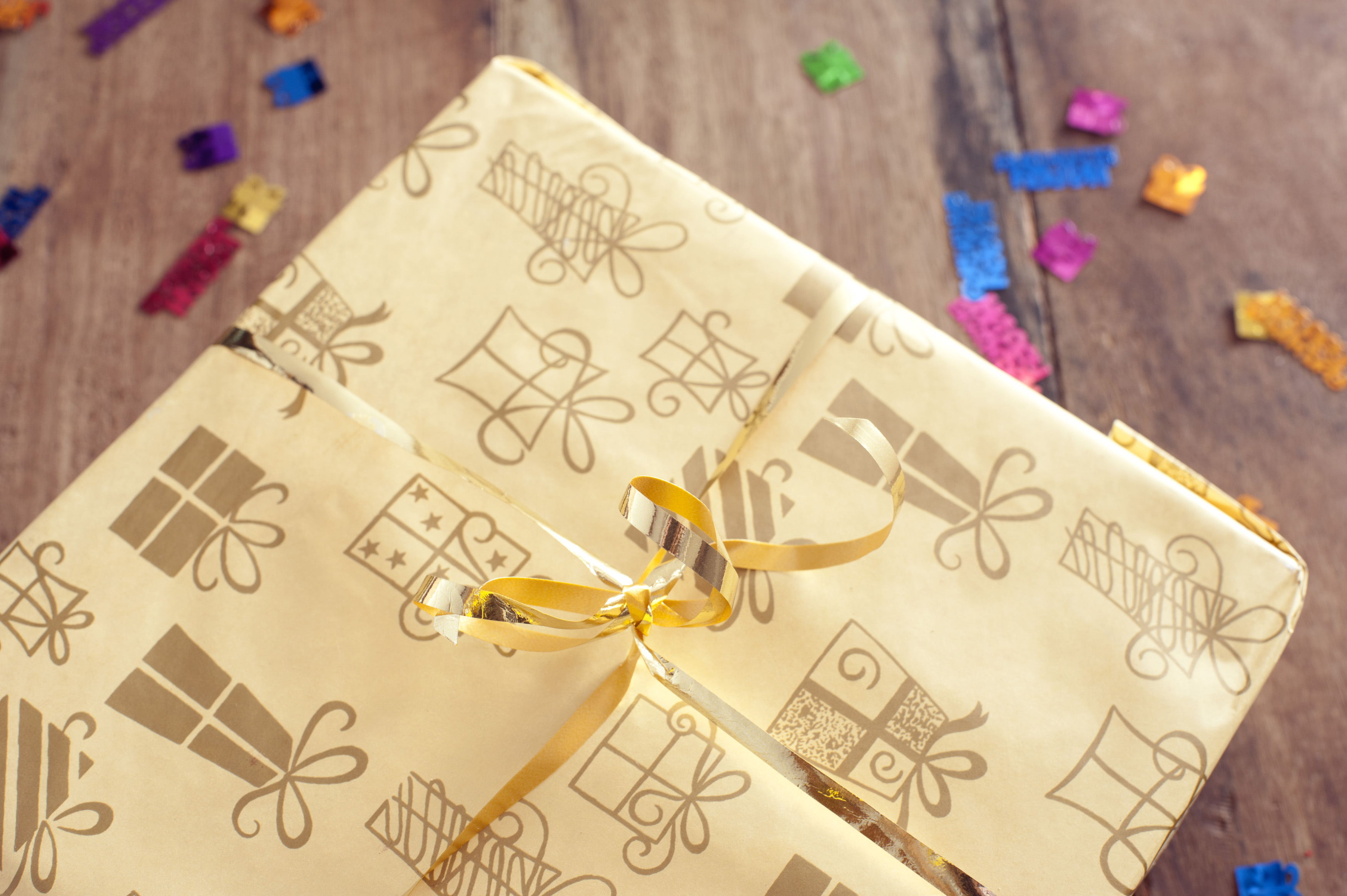 Wrapped gift with decorative patterned paper and a gold ribbon and bow standing on a wooden table with party confetti, close up view from the top
