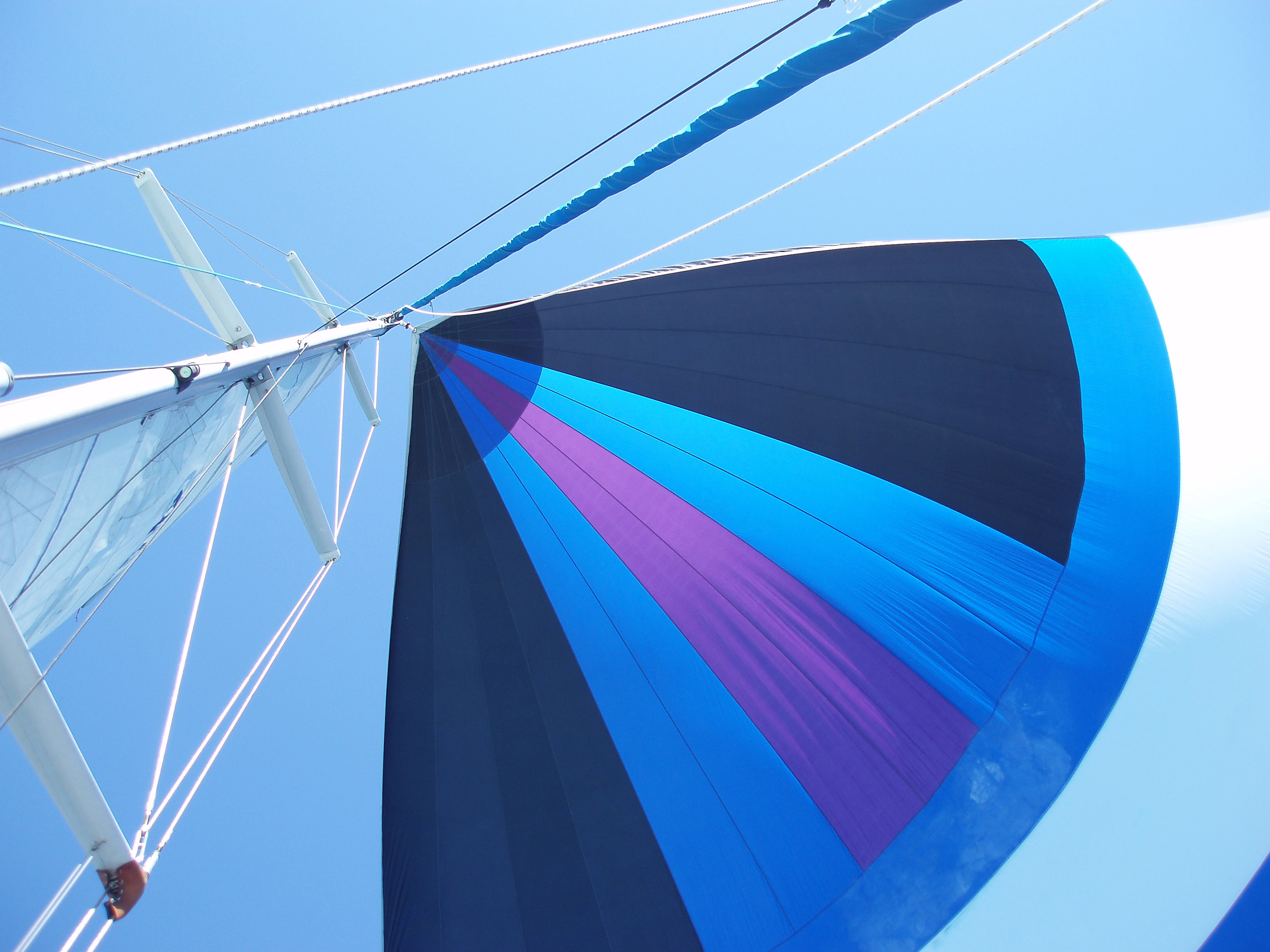 Keywords: boat, sail, yacht, bast, low angle view, upwards, sailing, yachting, sky, hoisted, kite, wind, blue, purple, pink