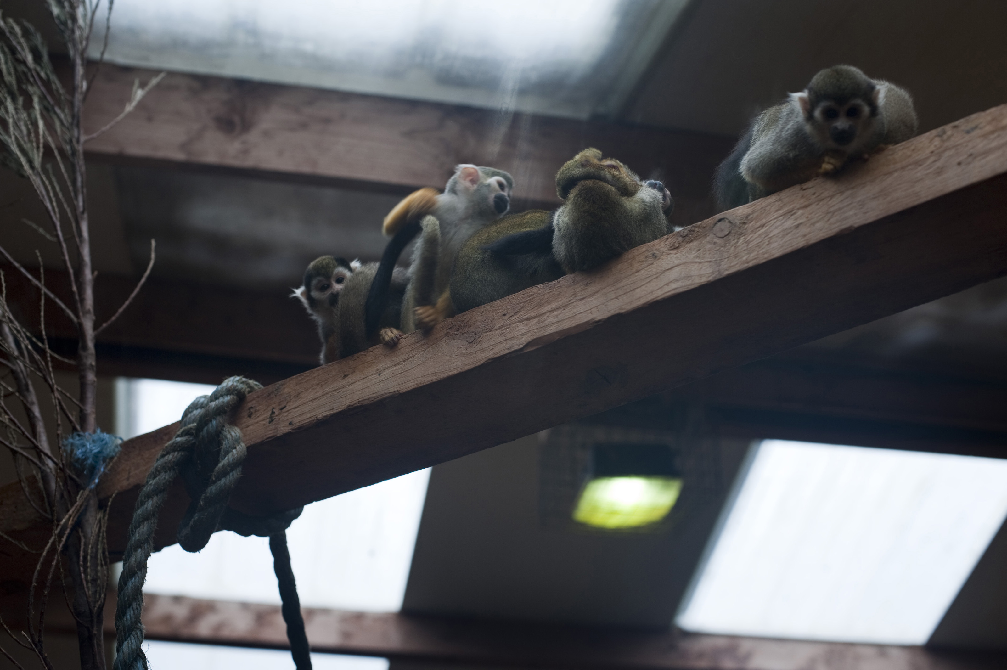 Group of monkeys on a perch in captivity in an undercover enclosure at a zoo