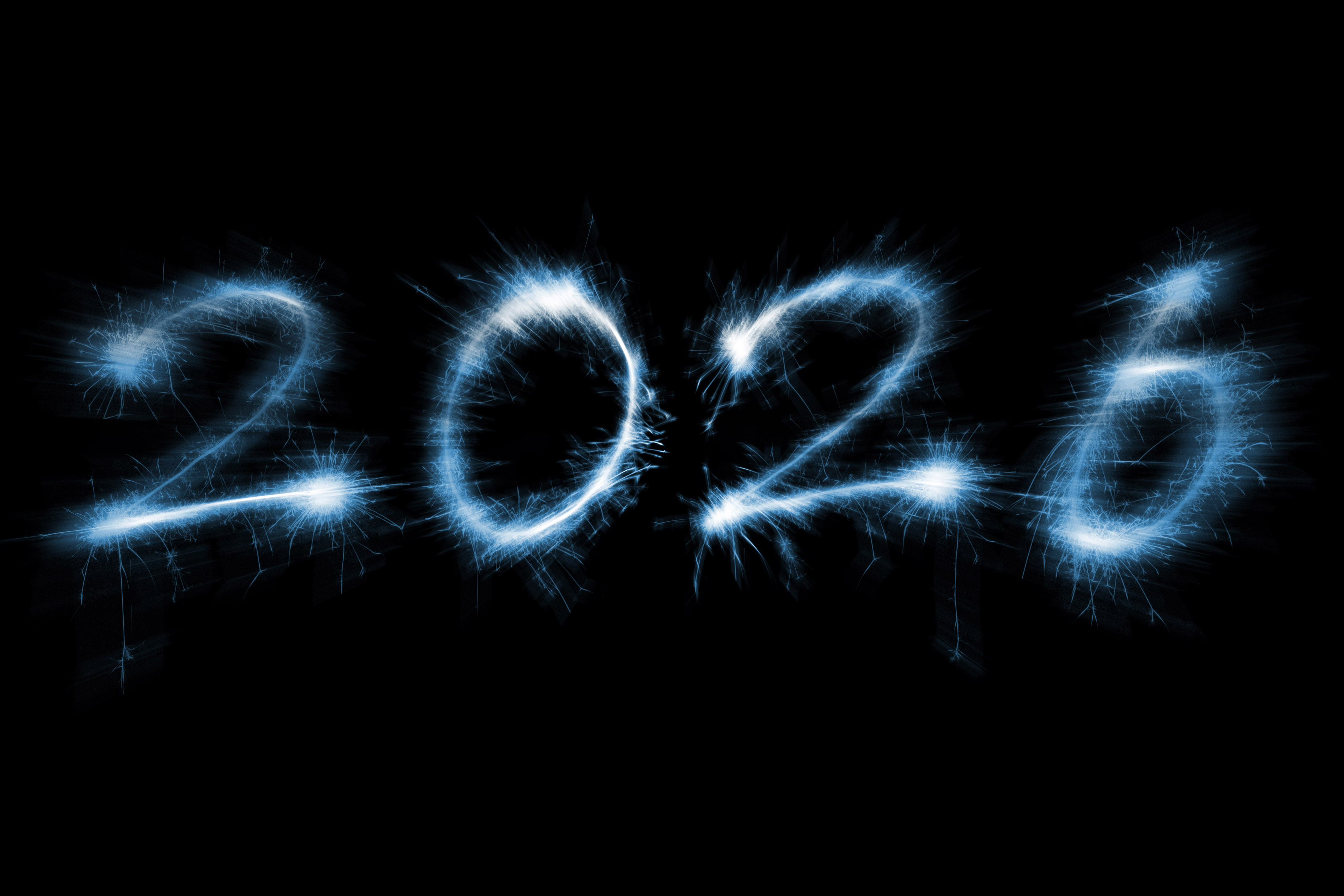 Numbers for New Year 2026 bursting out from a black background with bright ice blue sparks