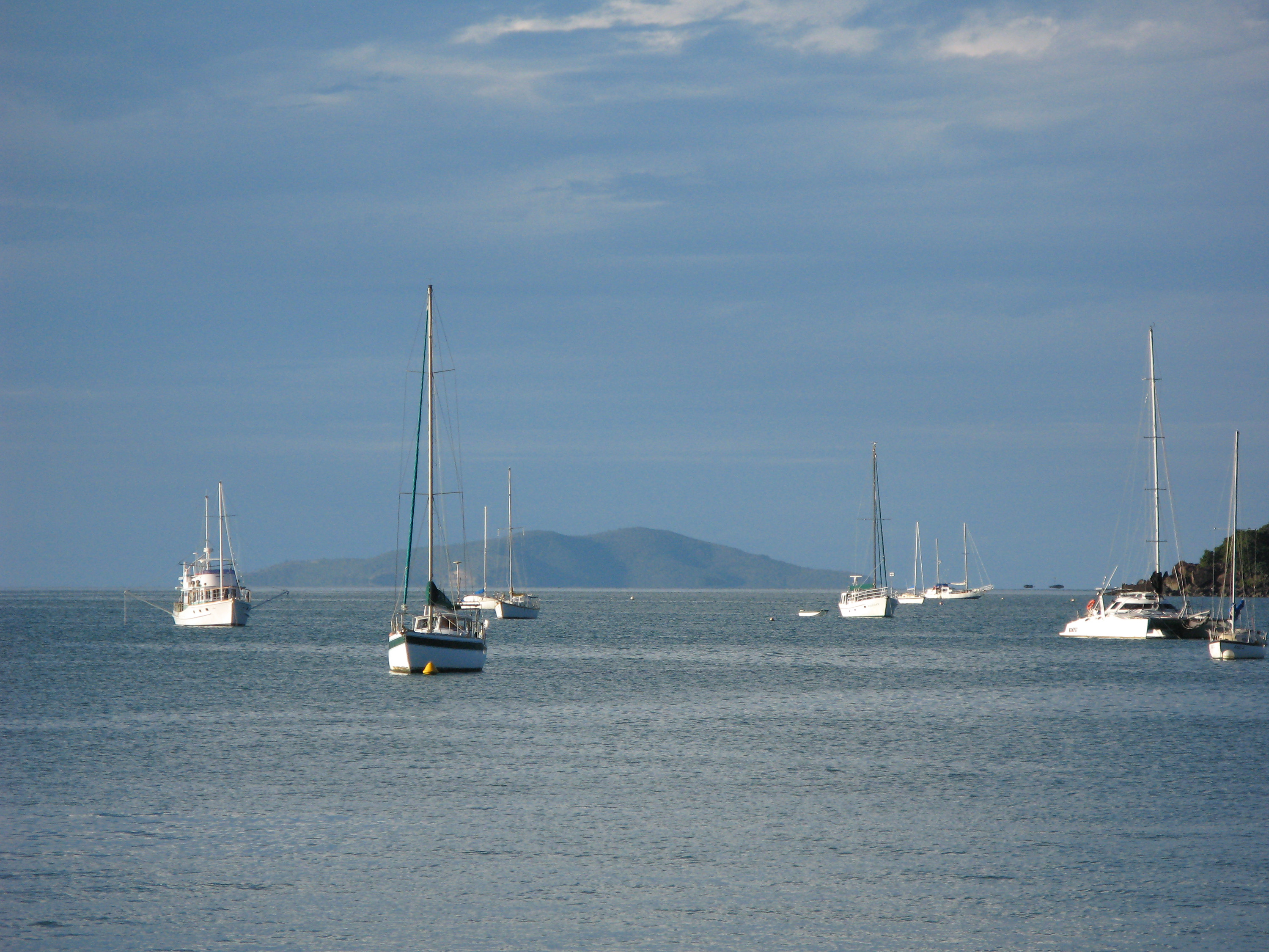 a view from airlie beach of the boats in pioneer bay, hayman island in the distanct