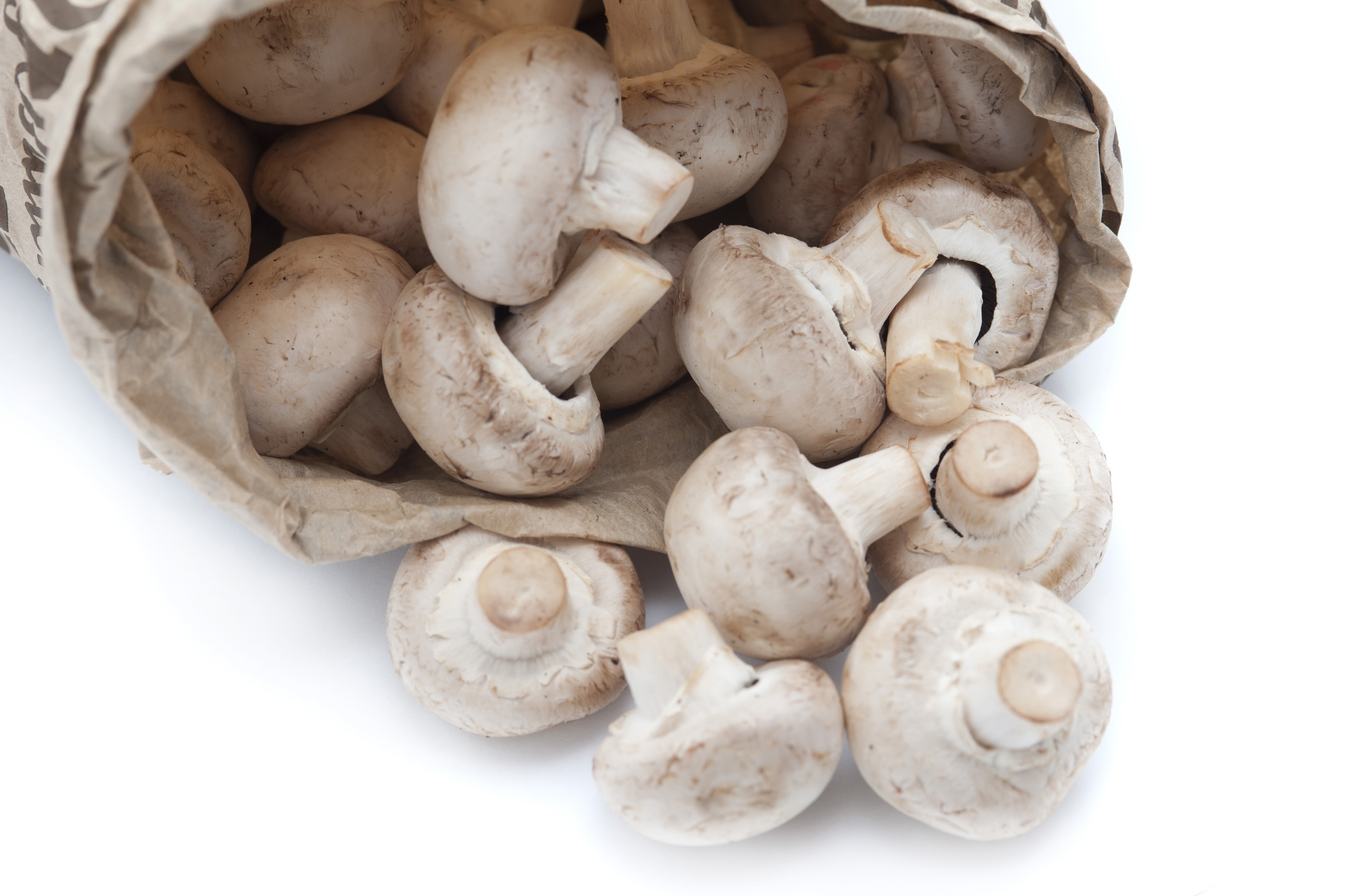 Keywords: agaricus bisporus, food, fungi, mushroom, savory, vegetable, bag, cultivated, spilling, vegan, vegetarian, background, harvest, healthy, white