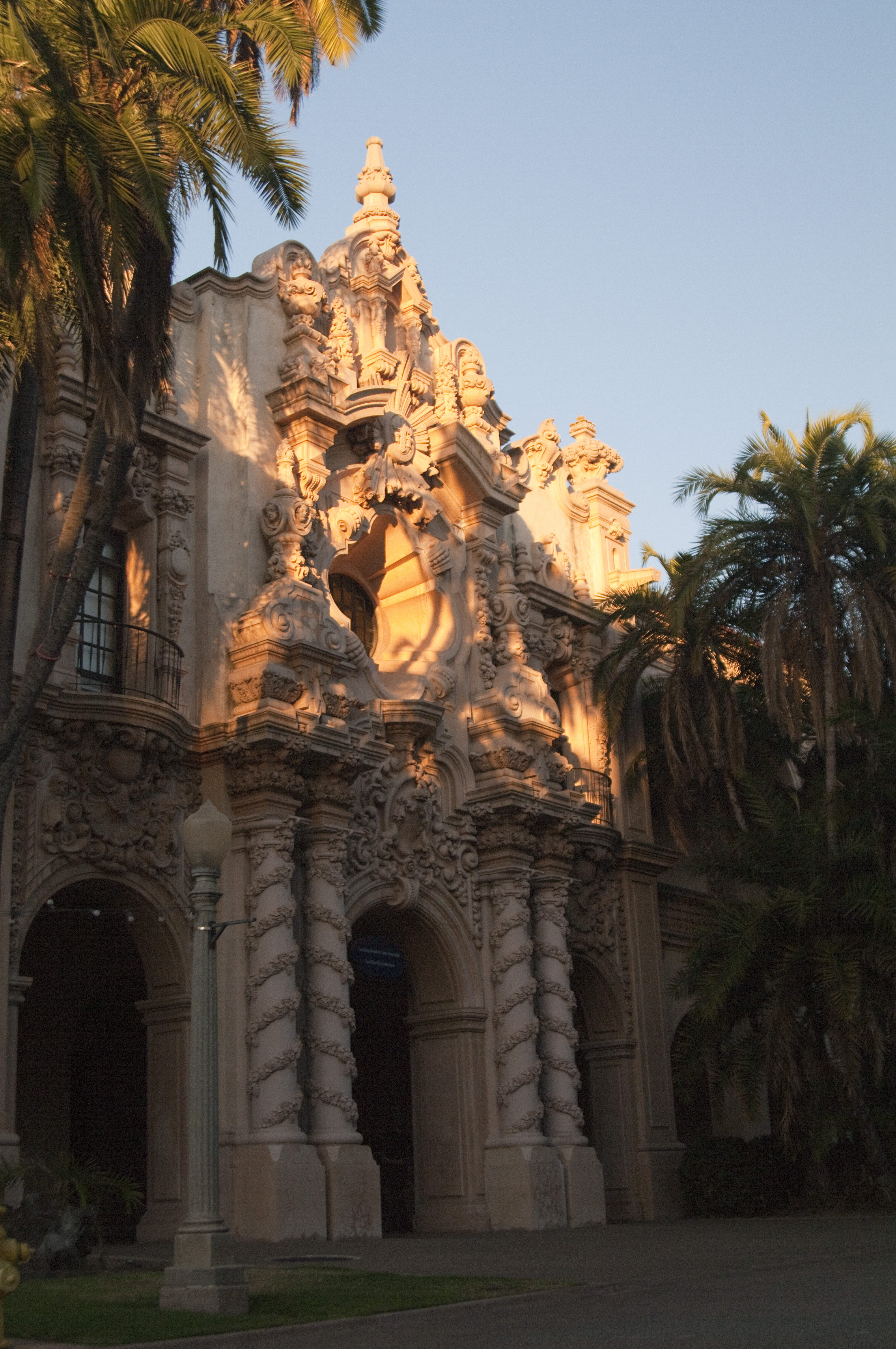 balboa park building facade in the Spanish Colonial Revival style, built for the 1915 Panama