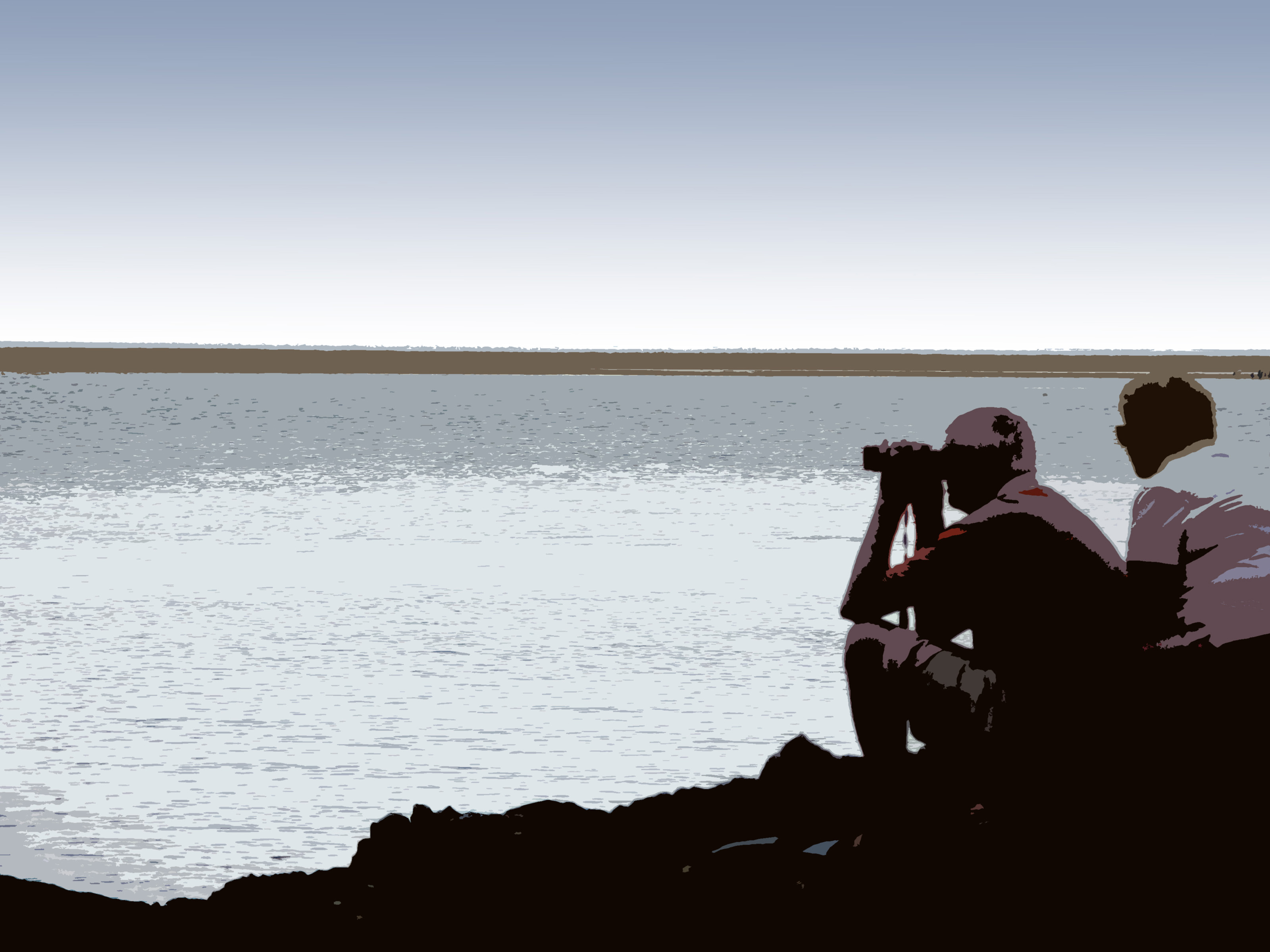 a traced image of 2 people looking through binoculars out to sea