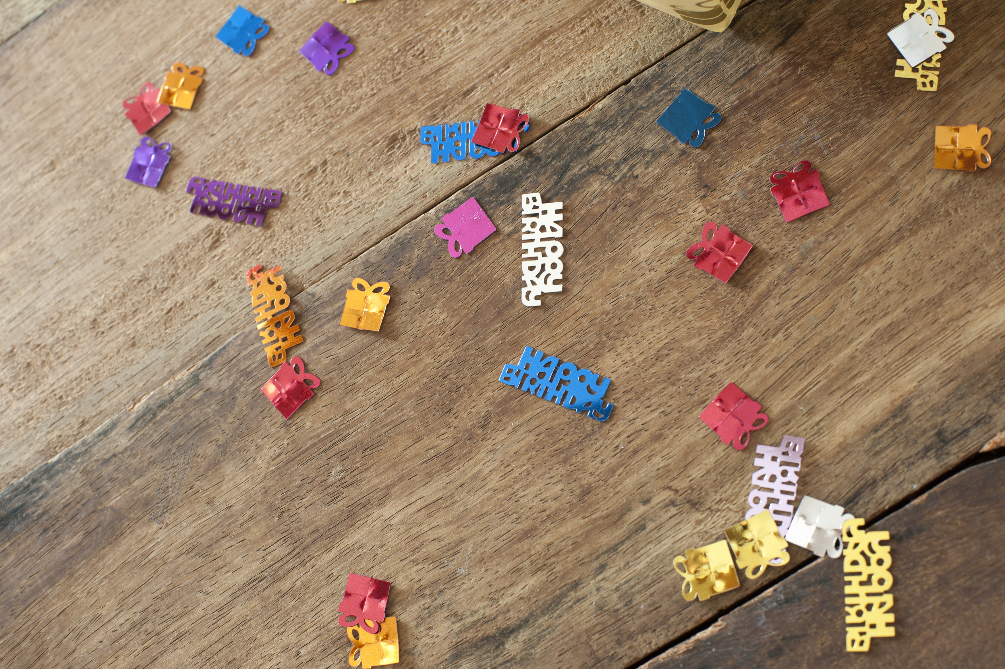 Keywords: birthday, celebration, colorful, confetti, copyspace, happy, party, scattered, sprinkles, table, wooden, decorations, gifts, presents, festive