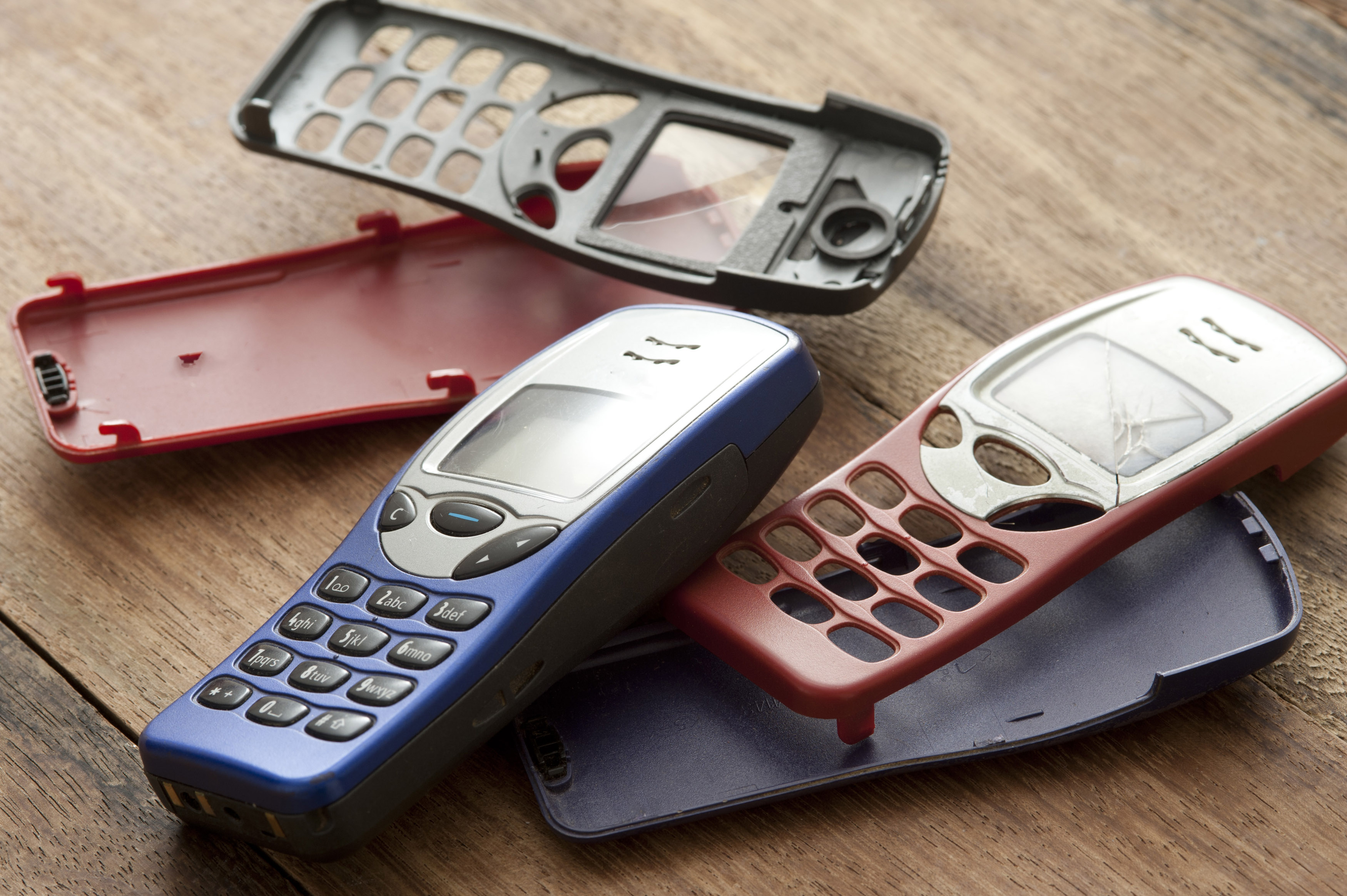 Old push-button candybar cell phone with several broken changeable cases close-up on wooden background