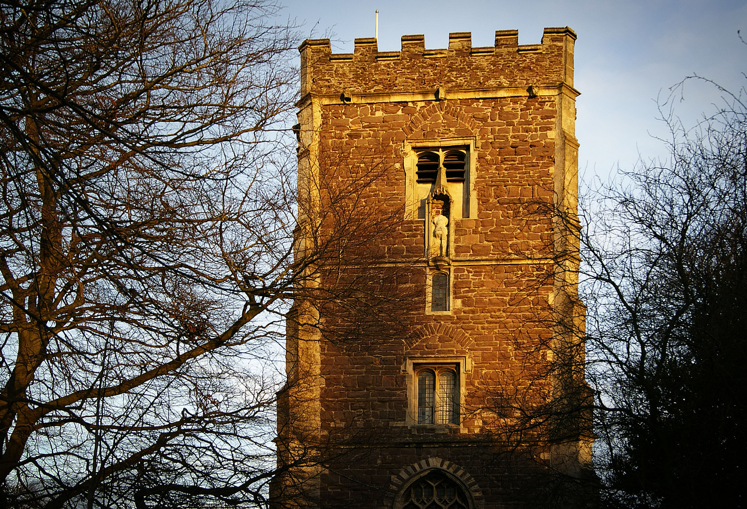 Keywords: sky,sunset,stone,church,tower,window,trees,brick,texture
