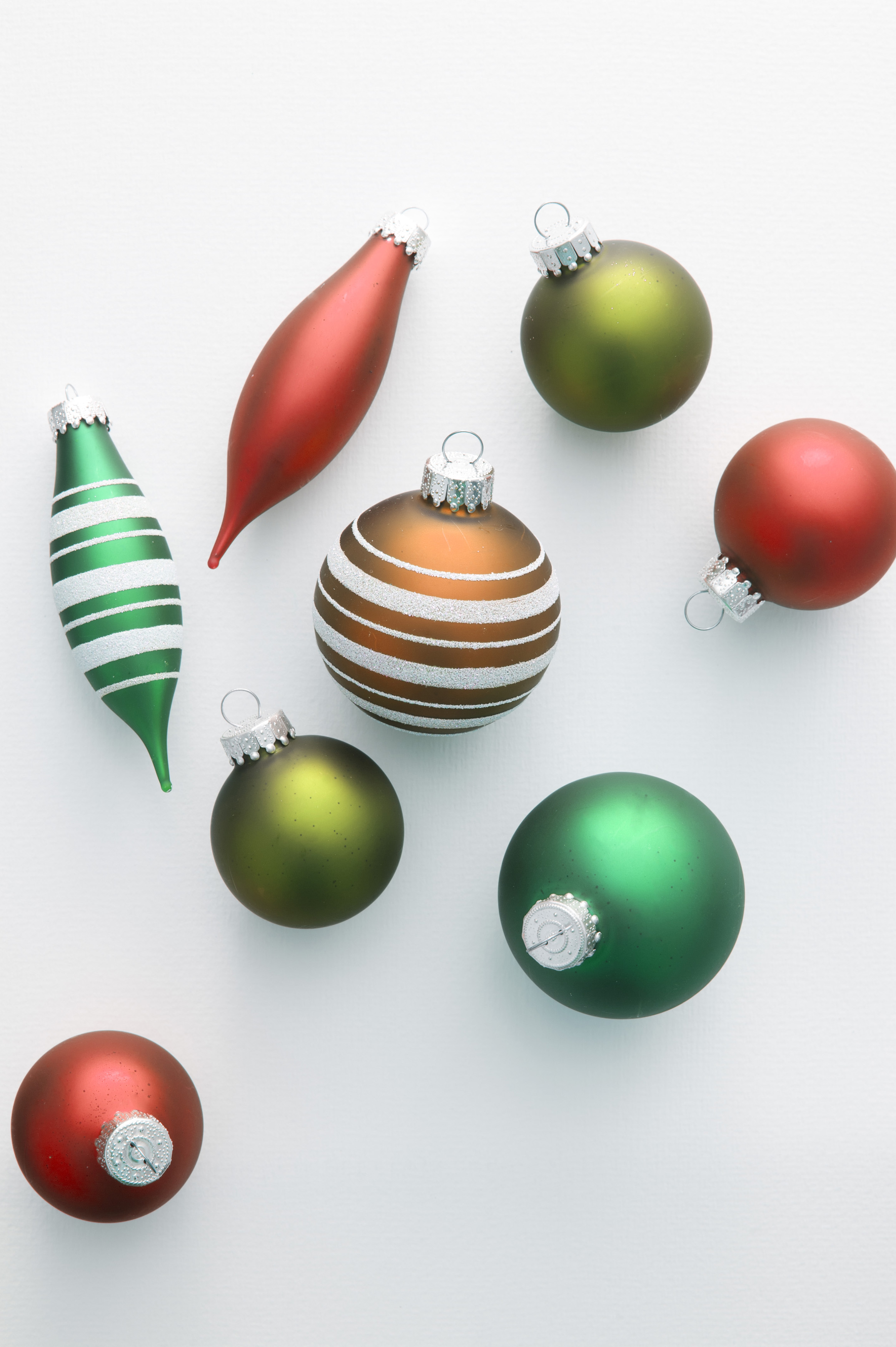 Keywords: assortment, balls, christmas, colorful, copy space, decorations, festive, green, ornaments, striped, variety, white background, above, high angle view, delicate, red, orange, glass, baubles