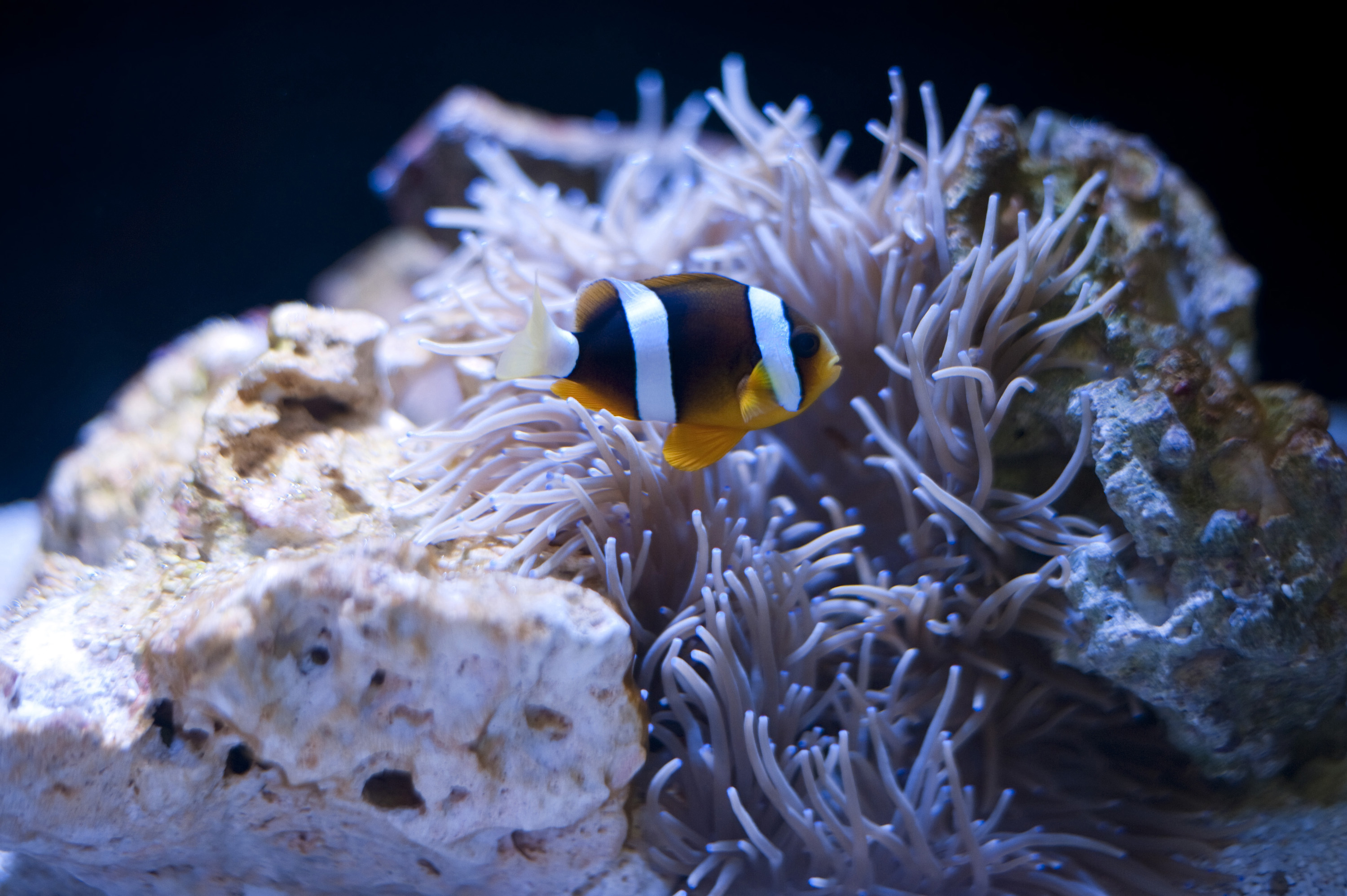Keywords: orange, protection, colourful, striped, symbiosis, tropical, exotic, marine, swimming, fish, aquatic, underwater, anemone, aquarium, reef, tentacles, clownfish, marine biology, anemonefish, amphiprioninae