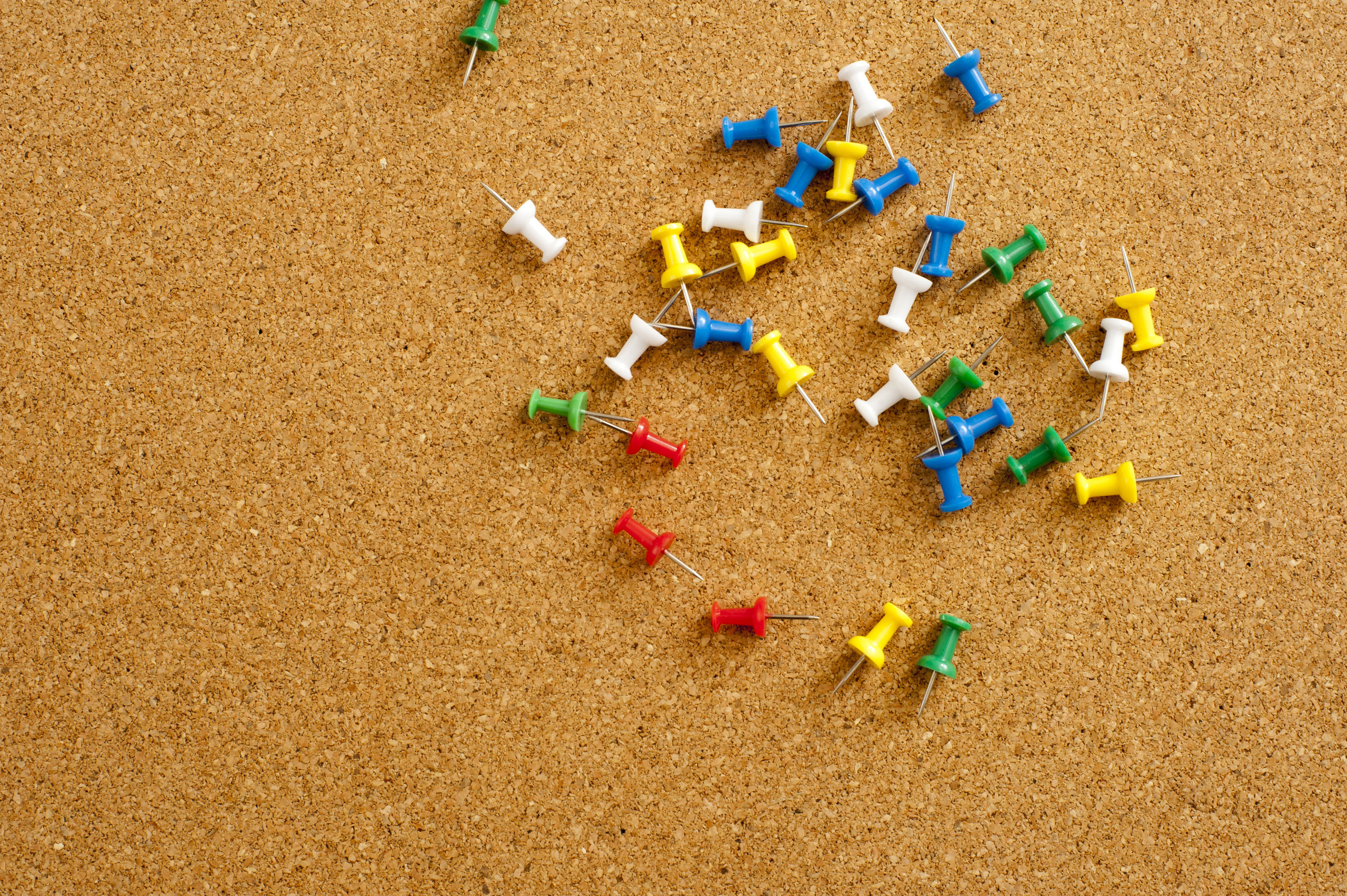 Photo Title: Scattered Colored Map Pins on Cork Board