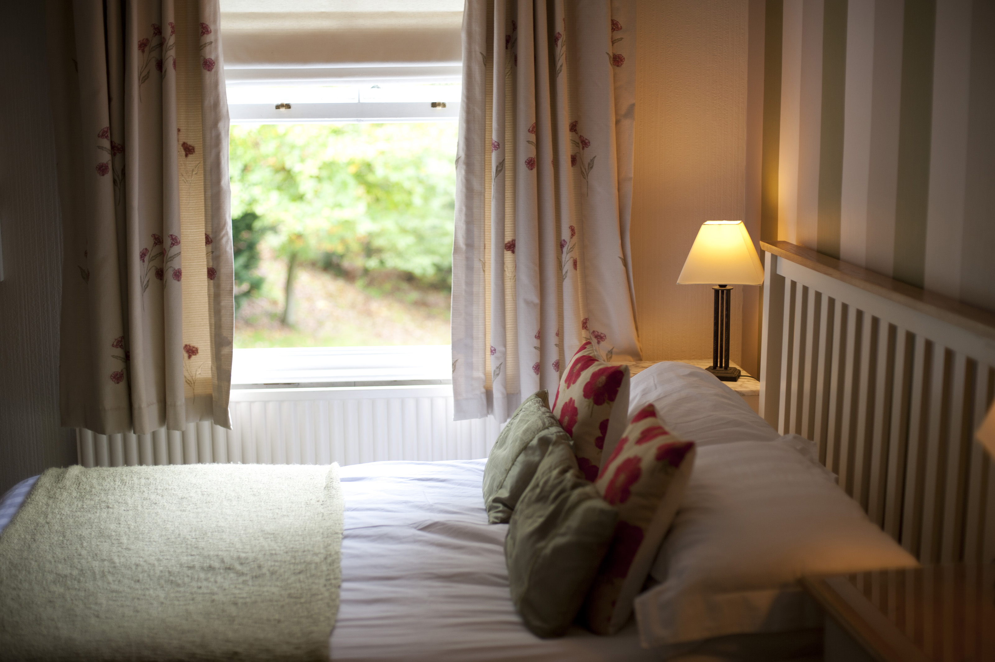 Keywords: bed, bedroom, country, decor, garden, interior, view, window, headboard, neutral, wooden, illuminated, lamp, homely, leafy, homely