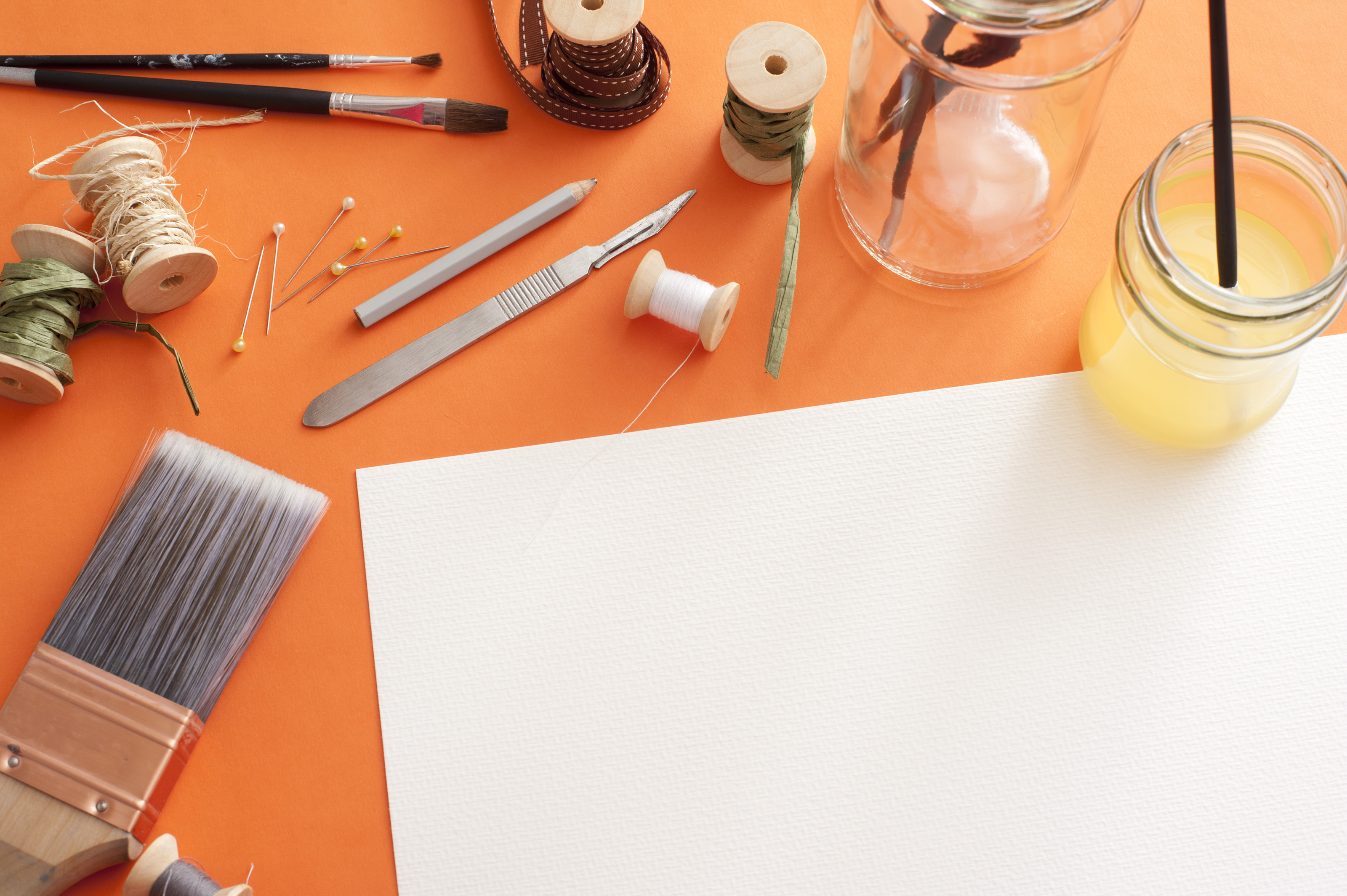Paintbrushes, pins, wire and other assorted painting tools around blank white sheet of paper with copy space over orange background