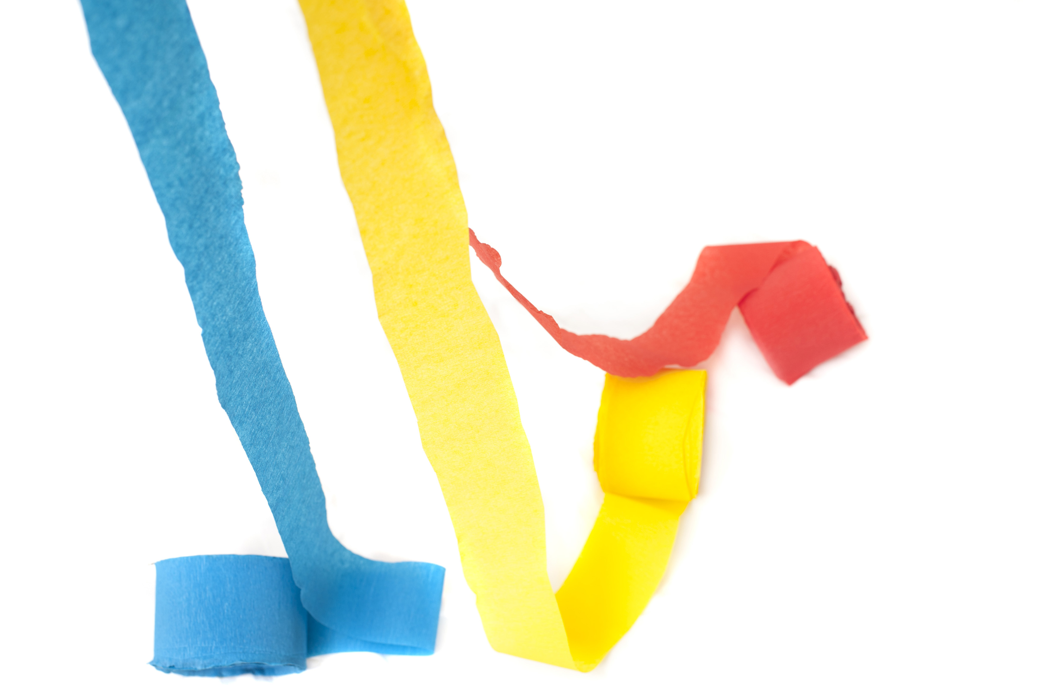 Crepe streamers for a party celebration in colorful red, yellow and blue still partially rolled over a white background with copyspace