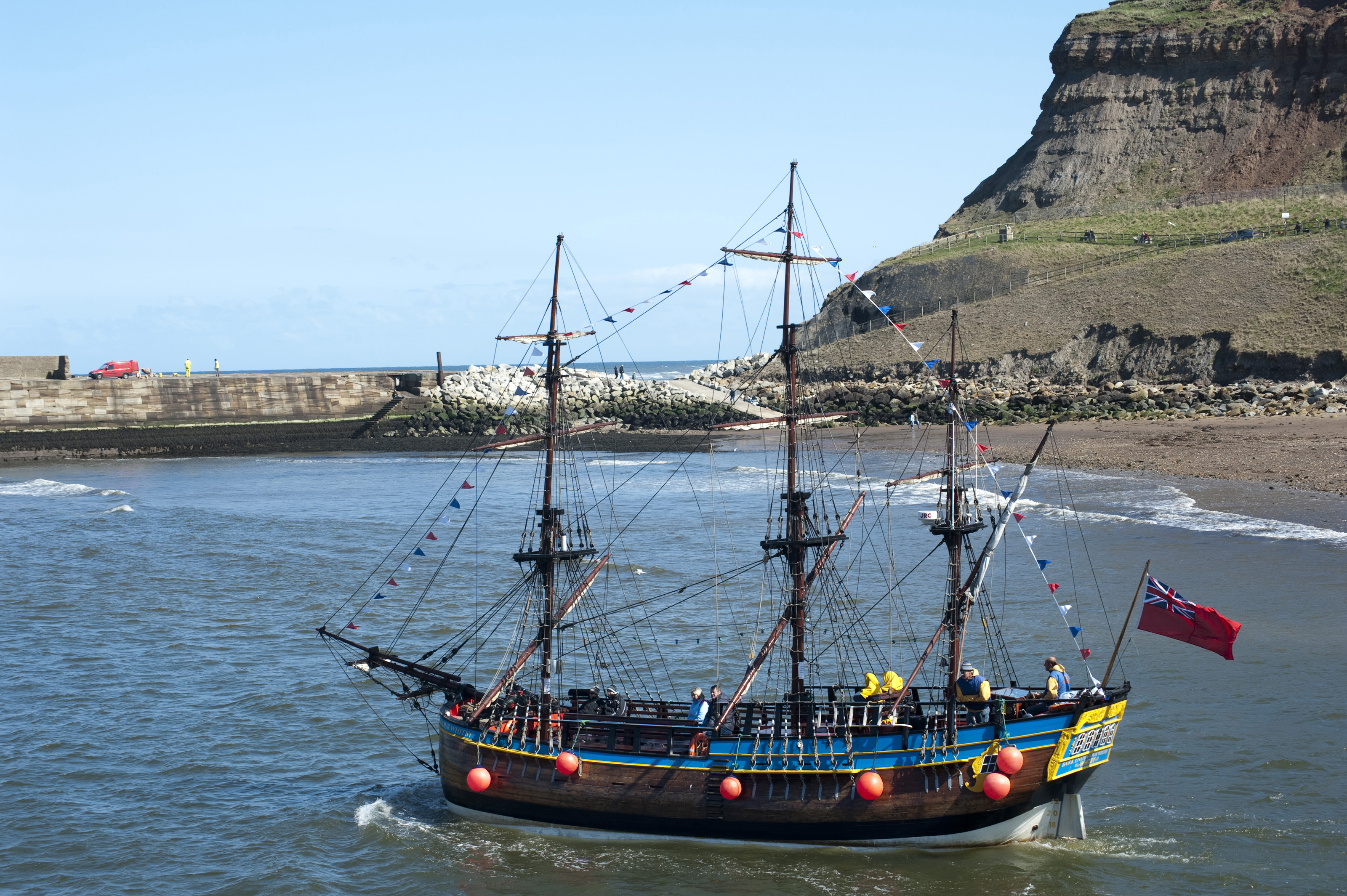 Keywords: whitby, north yorkshire, england, wooden, tourism, ship, cruise, replica, captain cook, scale model, full size, bark, sailing, endeavour, travel, coastline, historical, masts, sea, marine
