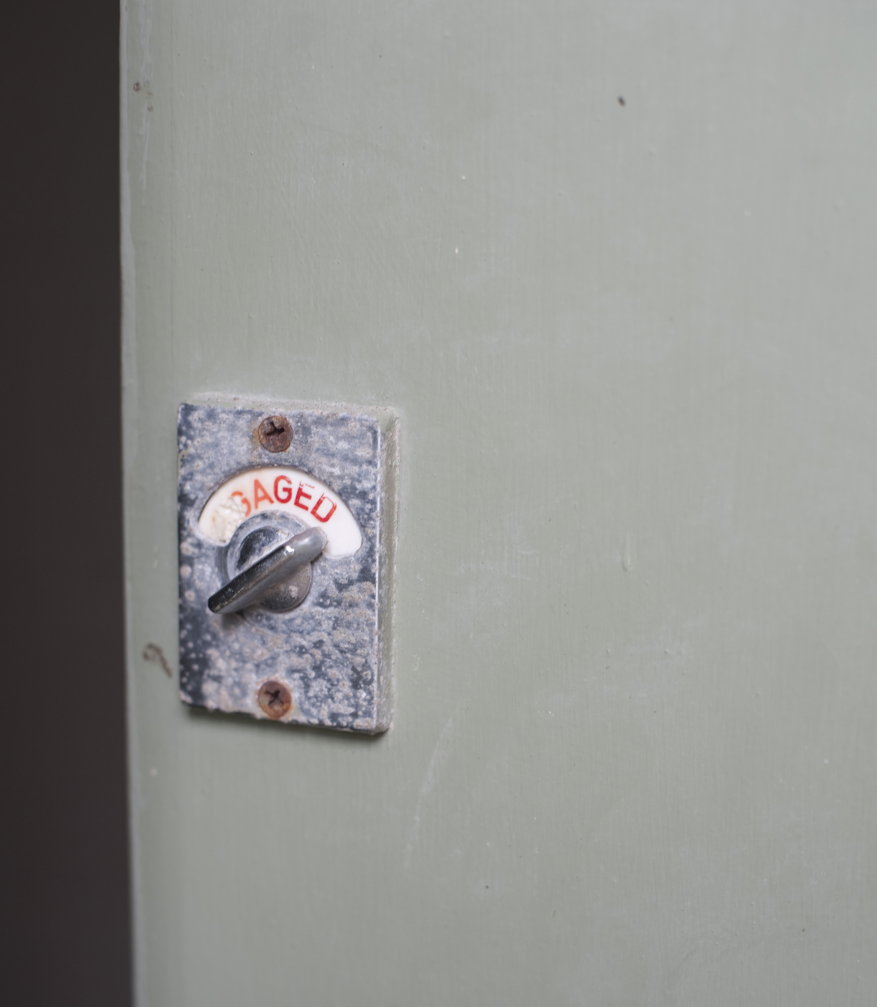Keywords: bathroom, closed, door, engaged, in use, occupied, public, sign, toilet, convenience, facility, lock, locked, rotary, handle, green