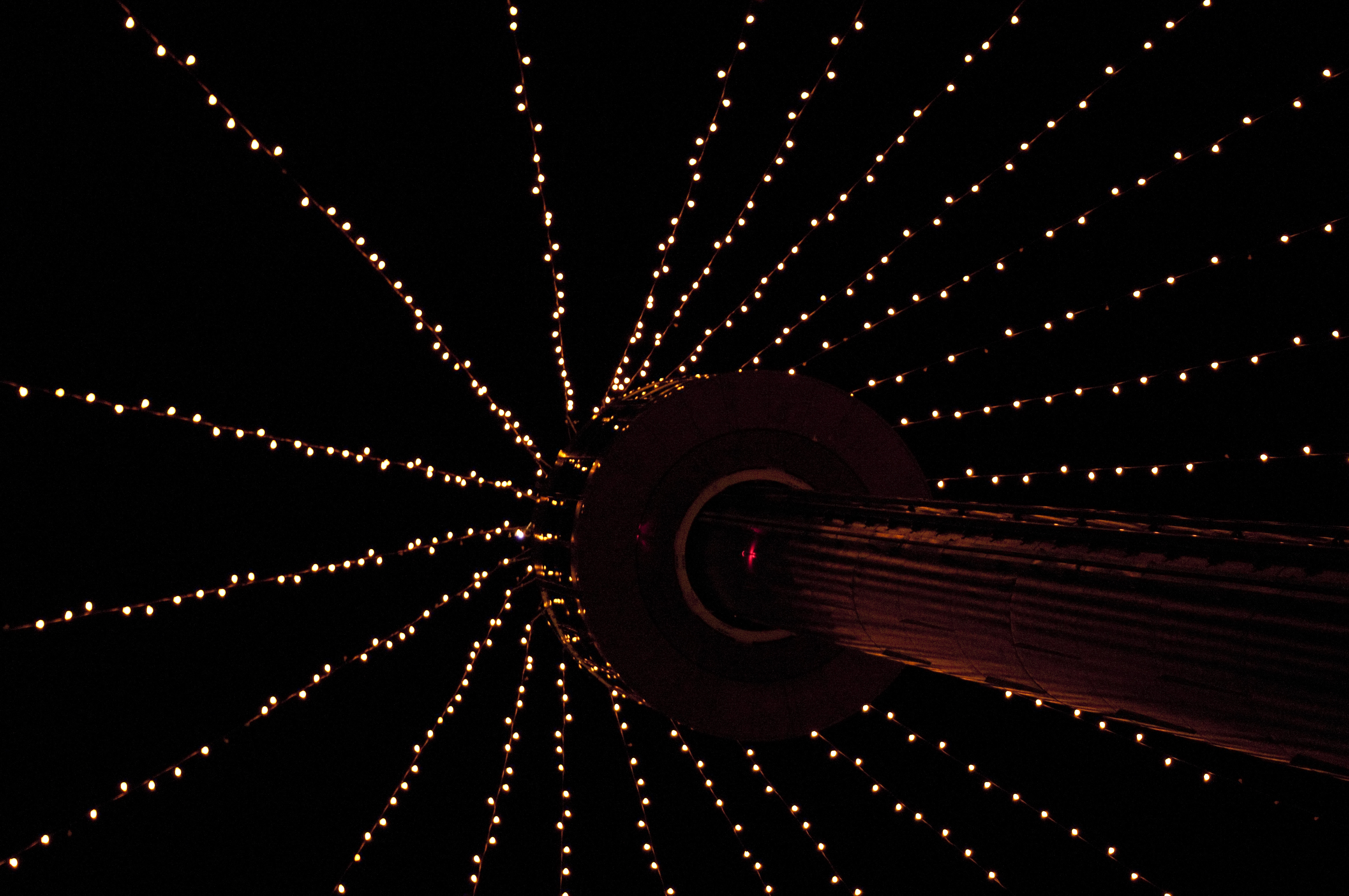 Keywords: holidays, christmas, seasonal, festive, christmas, lights, streamers, tower, decorated, glowing, sunset, dark